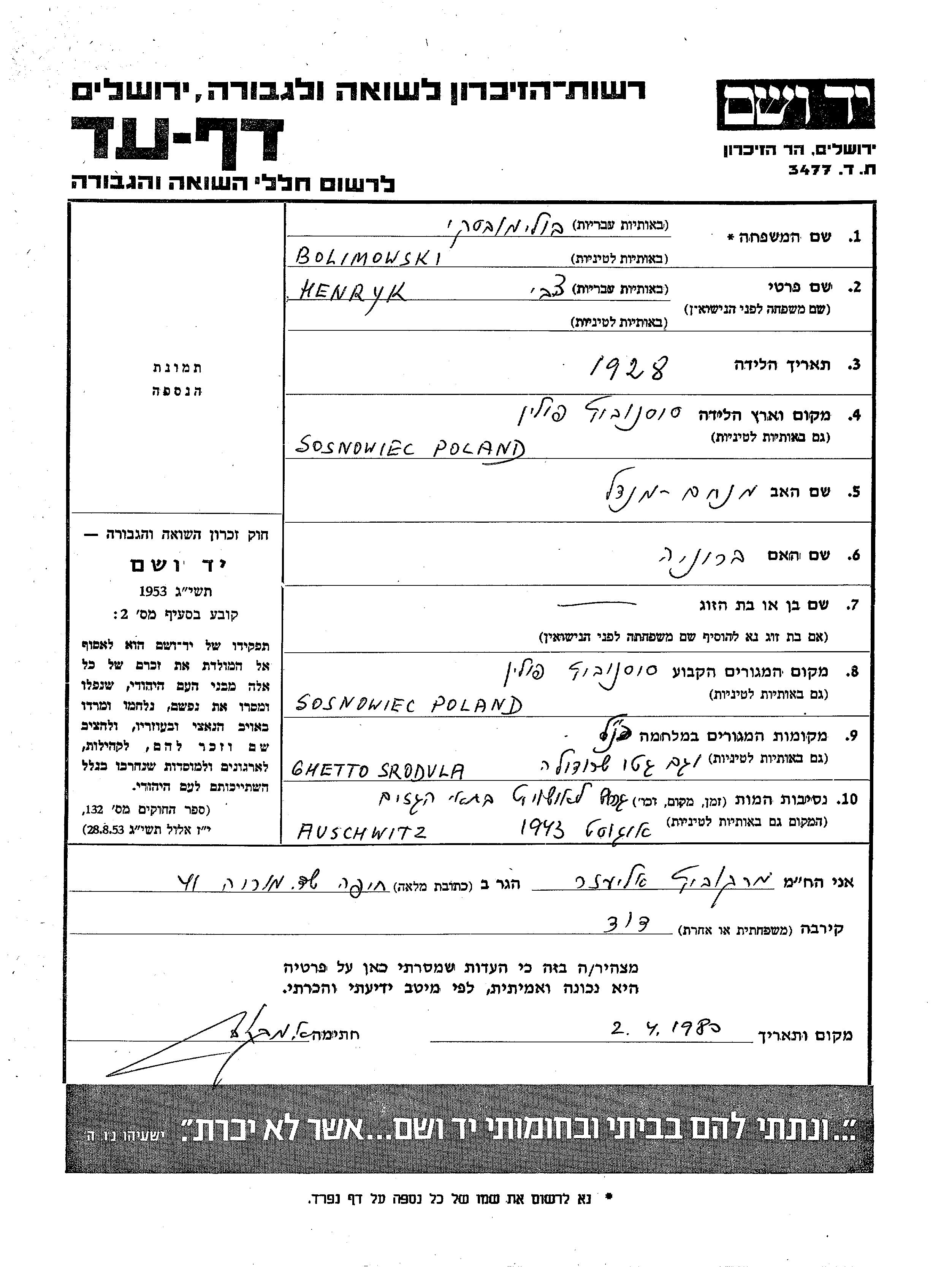 Henryk Tzvi Bolimowski wurde im Jahr 1928 in Sosnowic, Polen geboren. Er war der Sohn von Menakhem Mendel und Bronia. Vor dem Zweiten Weltkrieg lebte er in Sosnowic, Polen. Während des Krieges war er in Sosnowiec Srodula, Polen.