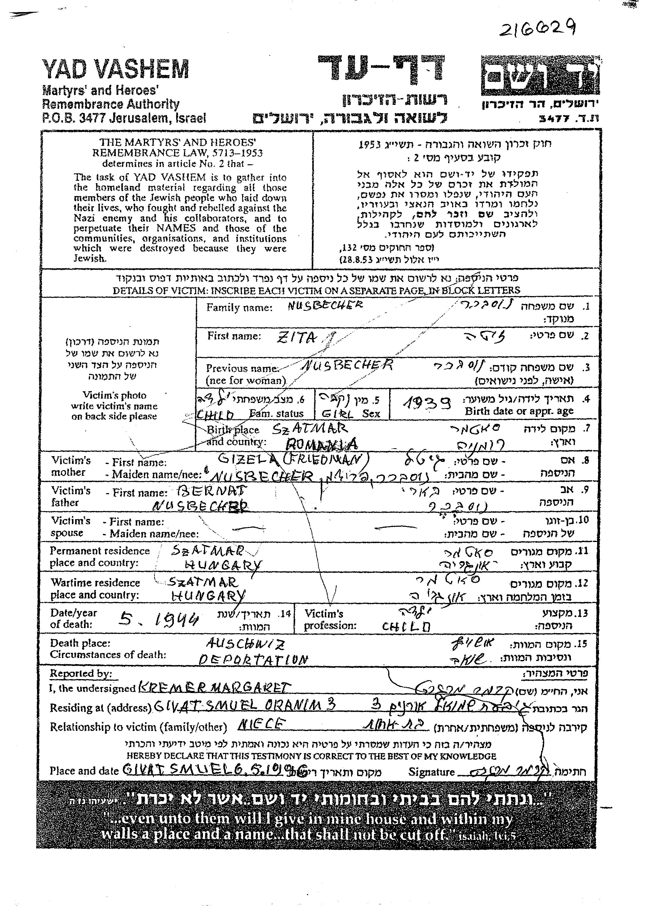 Zita Nussbacher wurde im Jahr 1939 in Szatmarnemeti, Rumänien geboren. Vor dem Zweiten Weltkrieg lebte sie in Szatmarnemeti, Rumänien.