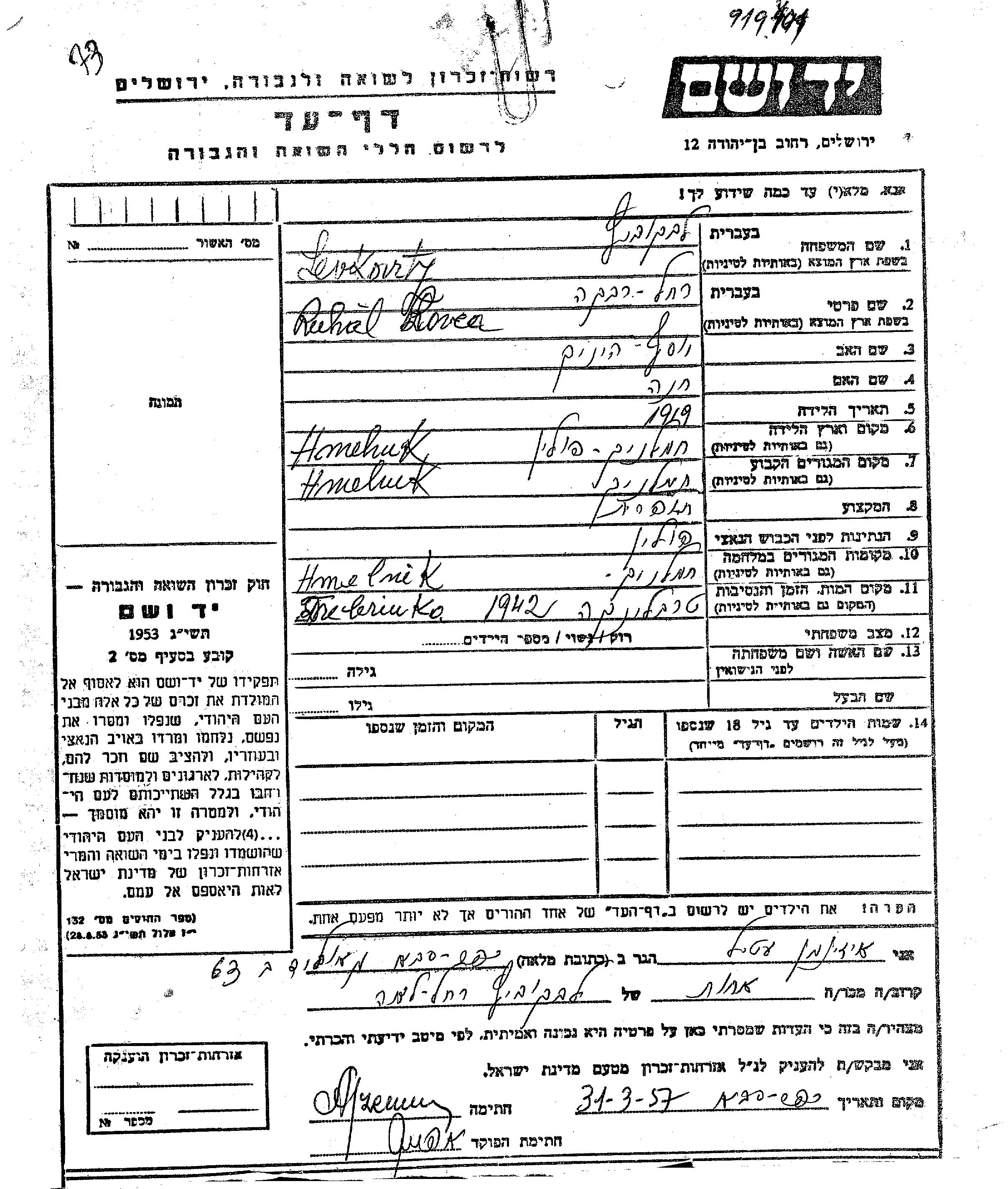 Ruhal Rivca Levkovitz wurde im Jahr 1919 in Hmelnik, Polen geboren. Sie war die Tochter von Yosef Khanokh und Khana. Sie war Schneiderin. Vor dem Zweiten Weltkrieg lebte sie in Hmelnik, Polen. Während des Krieges war sie in Hmelnik, Polen.