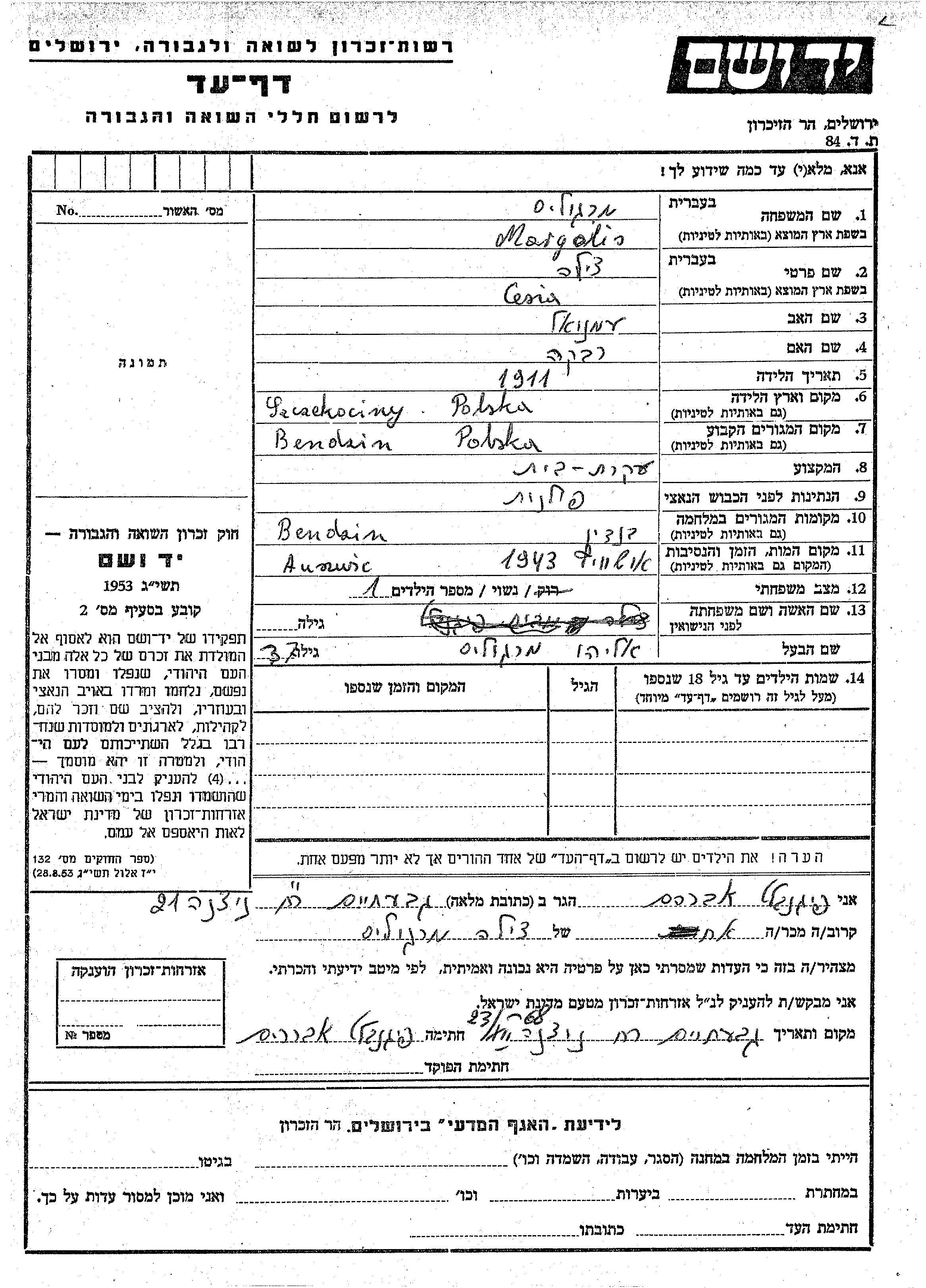 Cesia Tzila Margolis wurde im Jahr 1911 in Szczekociny, Polen geboren. Sie war die Tochter von Emanuel und Rivka. Sie war Hausfrau und mit Eliahu Verheiratet. Vor dem Zweiten Weltkrieg lebte sie in Bendzin, Polen. Während des Krieges war sie in Bendzin, Polen.