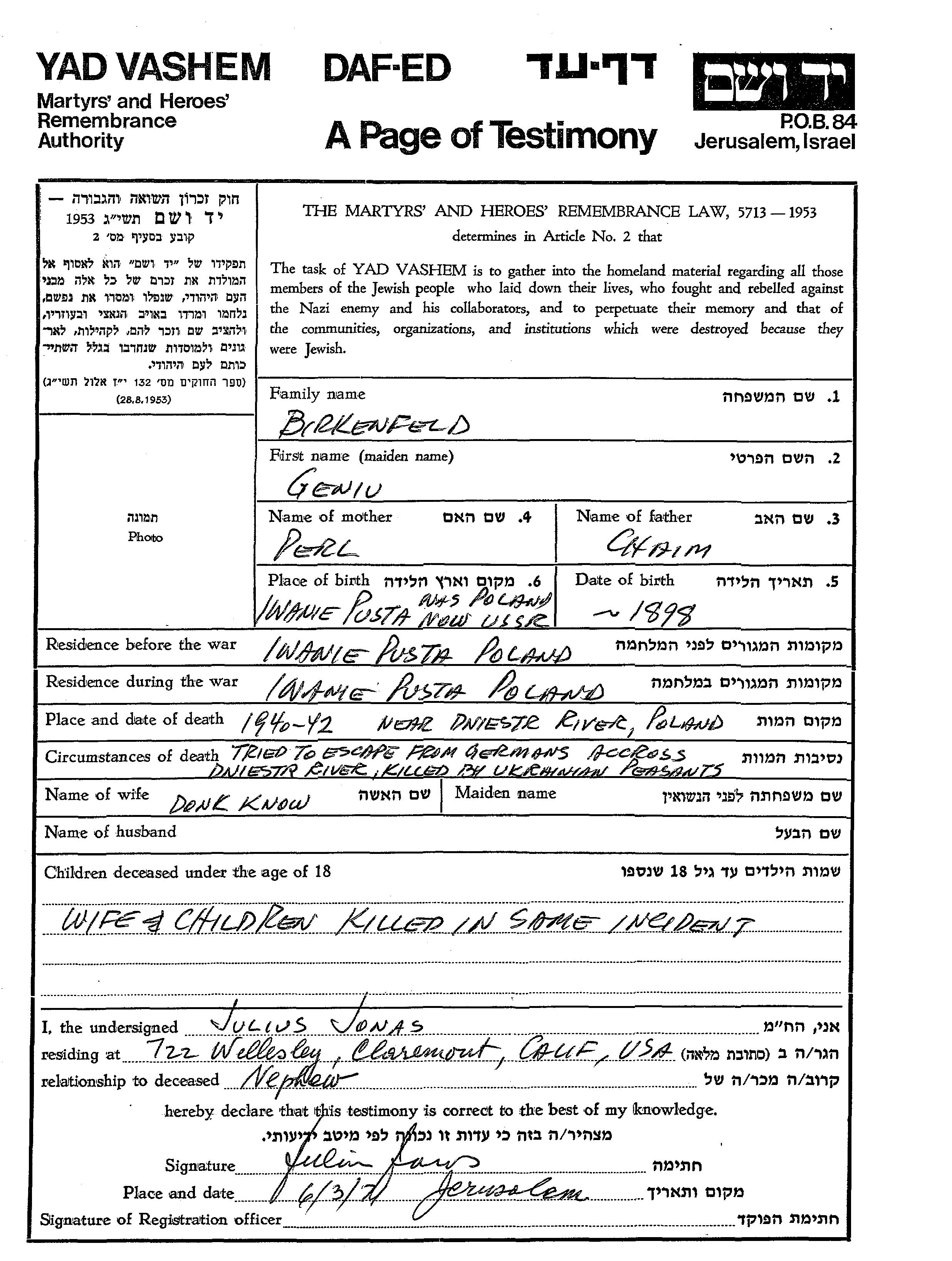 Geniu Birkenfeld wurde im Jahr 1898 in Iwanie Puste (Near Mielnica), Polen geboren. Er war der Sohn von Chaim und Perl. Er war Witwer. Vor dem Zweiten Weltkrieg lebte er in Iwanie Puste (Near Mielnica), Polen. Während des Krieges war er in Iwanie Puste (Near Mielnica), Polen.