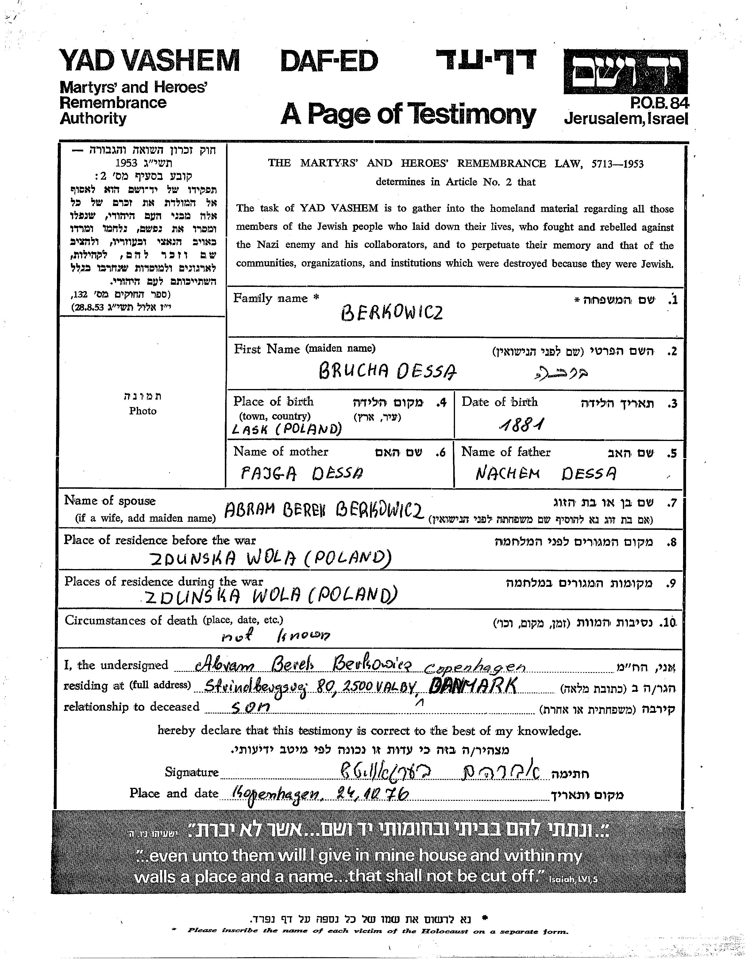 Brucha Berkowicz, geb. Dessa wurde im Jahr 1881 in Lask, Polen geboren. Sie war die Tochter von Nachem und Fajga. Vor dem Zweiten Weltkrieg lebte sie in Zdunska Vola, Polen. Während des Krieges war sie in Zdunska Vola, Polen.
