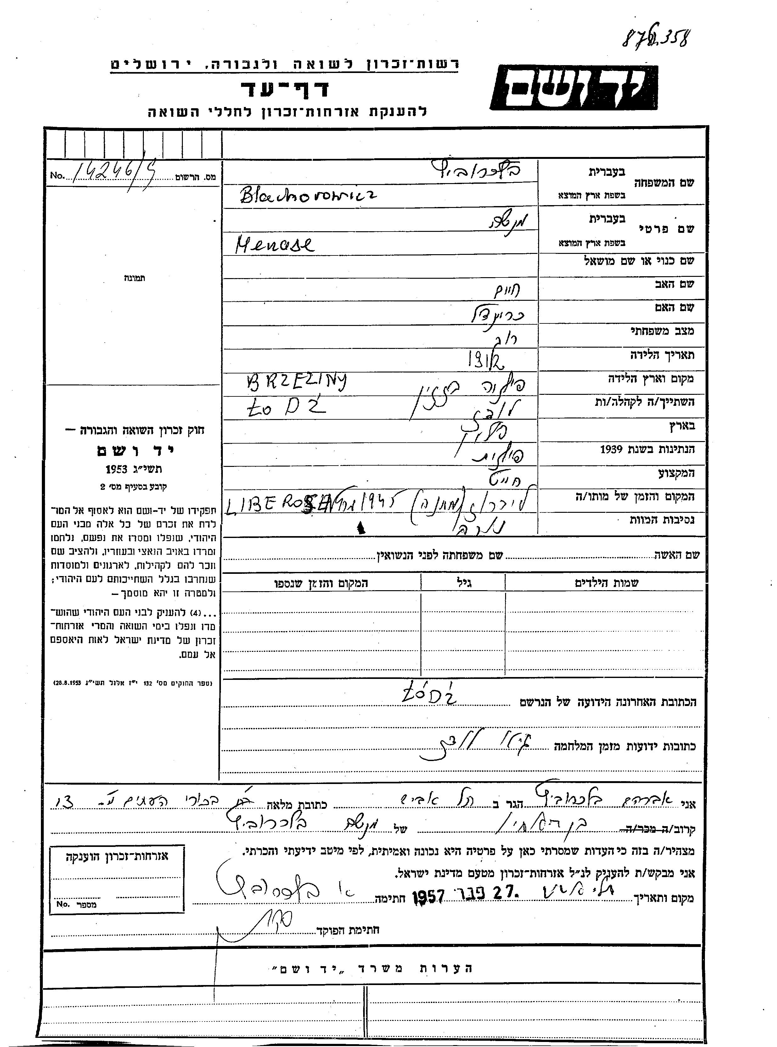Menase Blachorowicz wurde im Jahr 1912 in Brzeziny, Polen geboren. Er war der Sohn von Khaim und Braindel. Er war Schneider und Ledig. Vor dem Zweiten Weltkrieg lebte er in Lodz, Polen. Während des Krieges war er in Lodz, Polen.