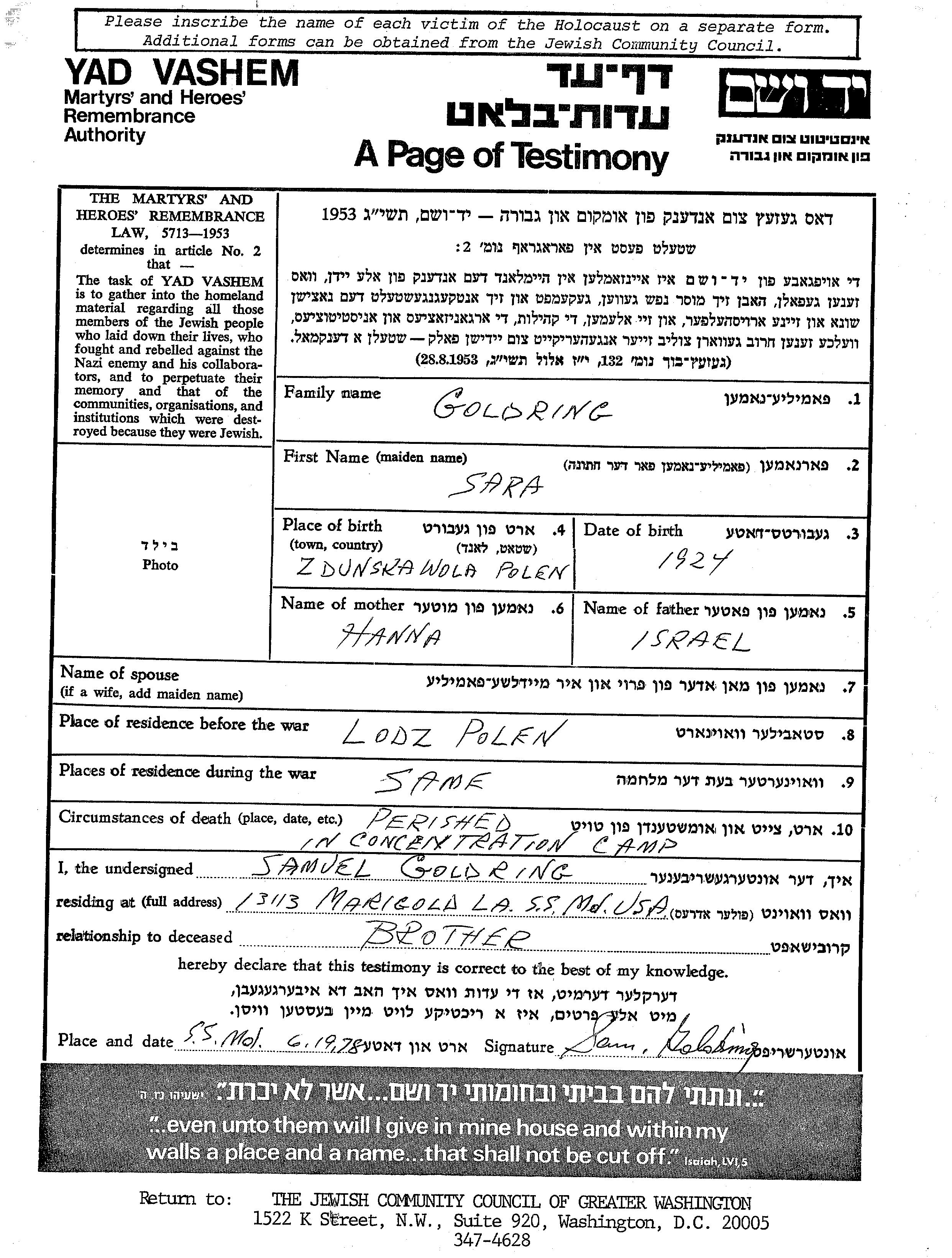 Sara Goldring wurde im Jahr 1924 in Zdunska Wola, Polen geboren. Sie war die Tochter von Israel und Hanna. Vor dem Zweiten Weltkrieg lebte sie in Lodz, Polen. Während des Krieges war sie in Lodz, Polen.