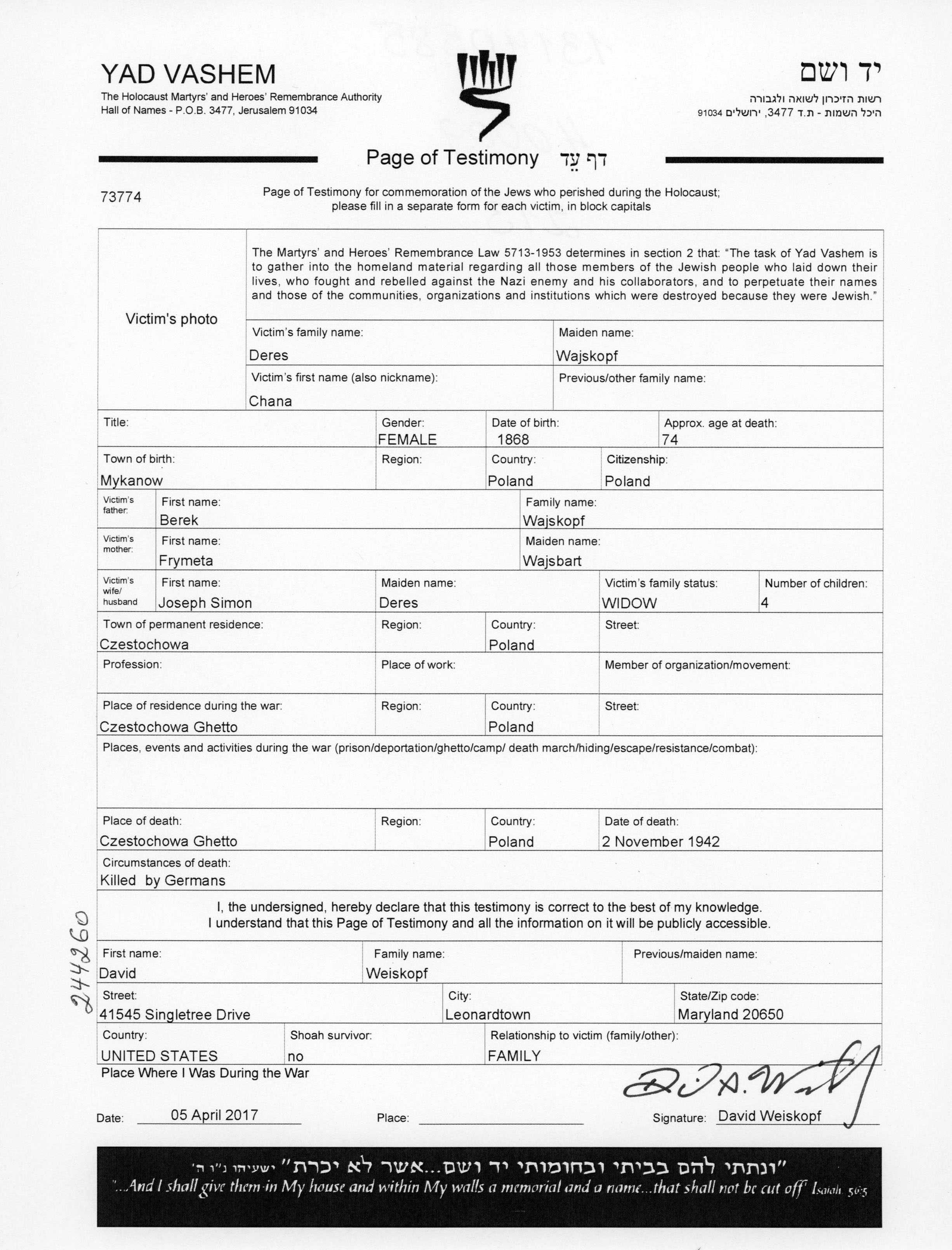 Chana Deres, geb. Wajskop wurde im Jahr 1868 in Mykanow, Polen geboren. Vor dem Zweiten Weltkrieg lebte sie in Czestochowa, Polen.