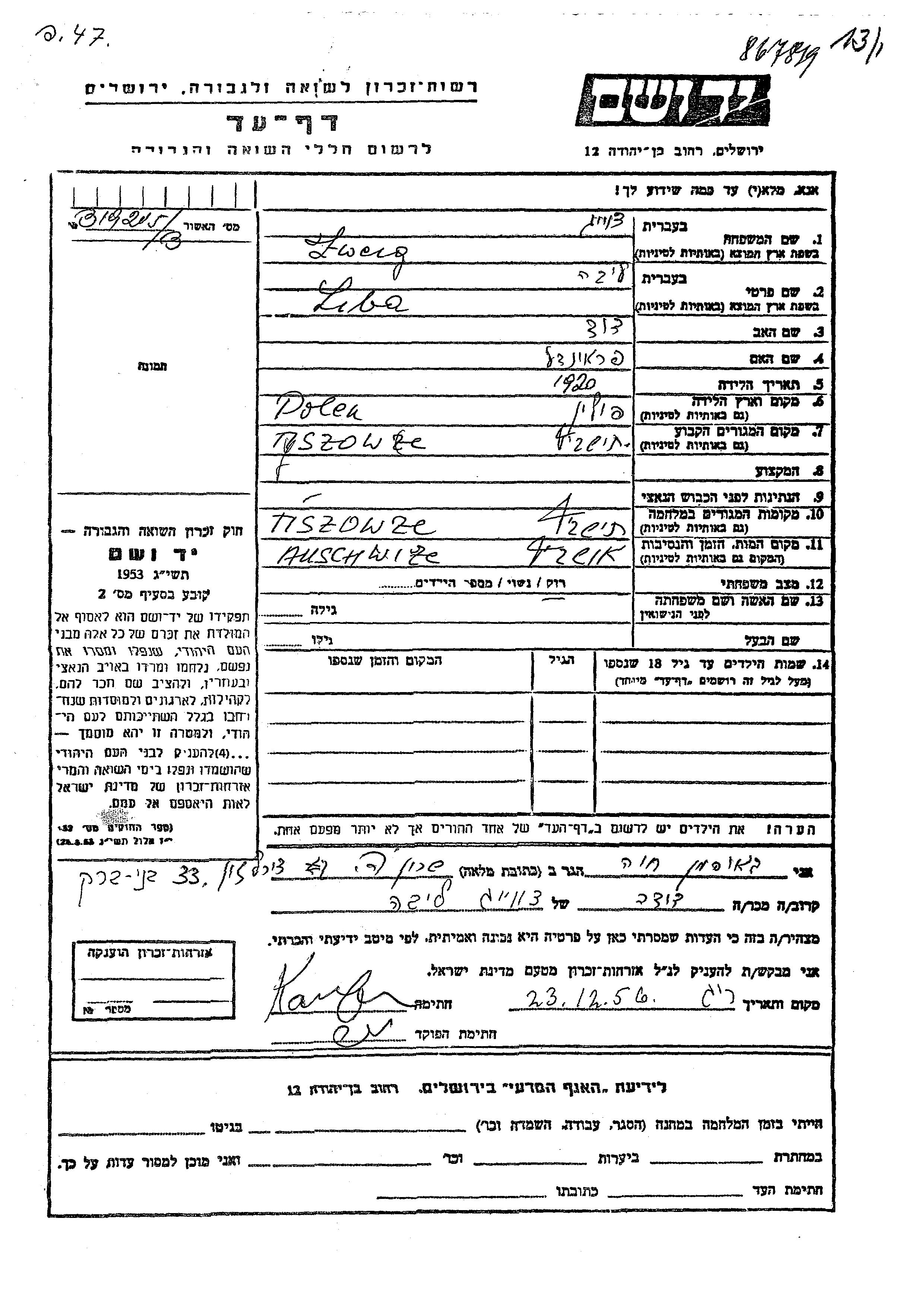 Liba Zweig wurde im Jahr 1920 in Polen geboren. Sie war die Tochter von David und Fraindel. Sie war Ledig. Vor dem Zweiten Weltkrieg lebte sie in Tyszowce, Polen. Während des Krieges war sie in Tyszowce, Polen.