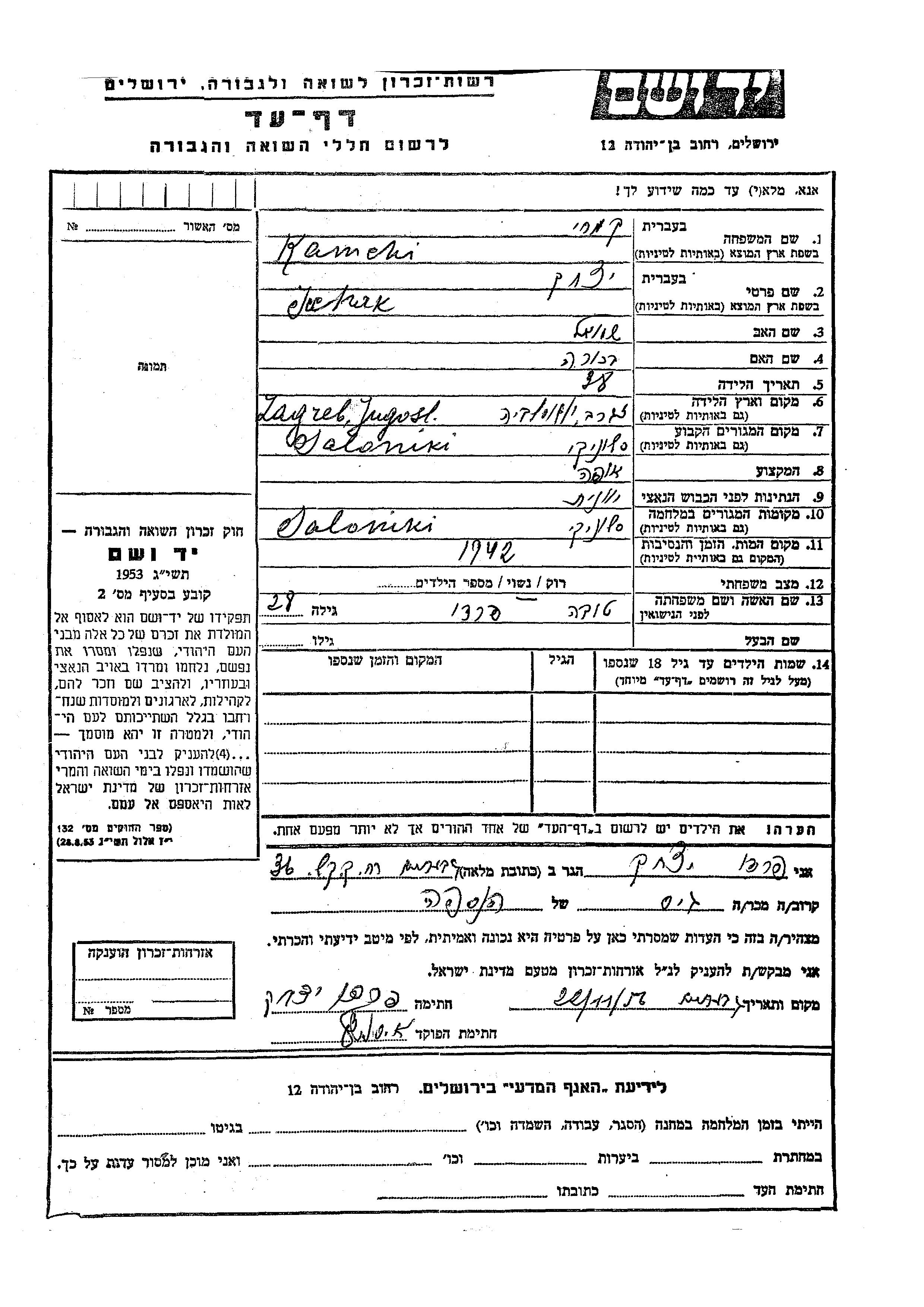 Icchak Kamchi wurde in Zagreb, Jugoslawien geboren. Er war der Sohn von Shmuel und Bekhora. Er war Bäcker/-in und mit Tova, geb. Feredi Verheiratet. Vor dem Zweiten Weltkrieg lebte er in Saloniki, Griechenland. Während des Krieges war er in Saloniki, Griechenland.