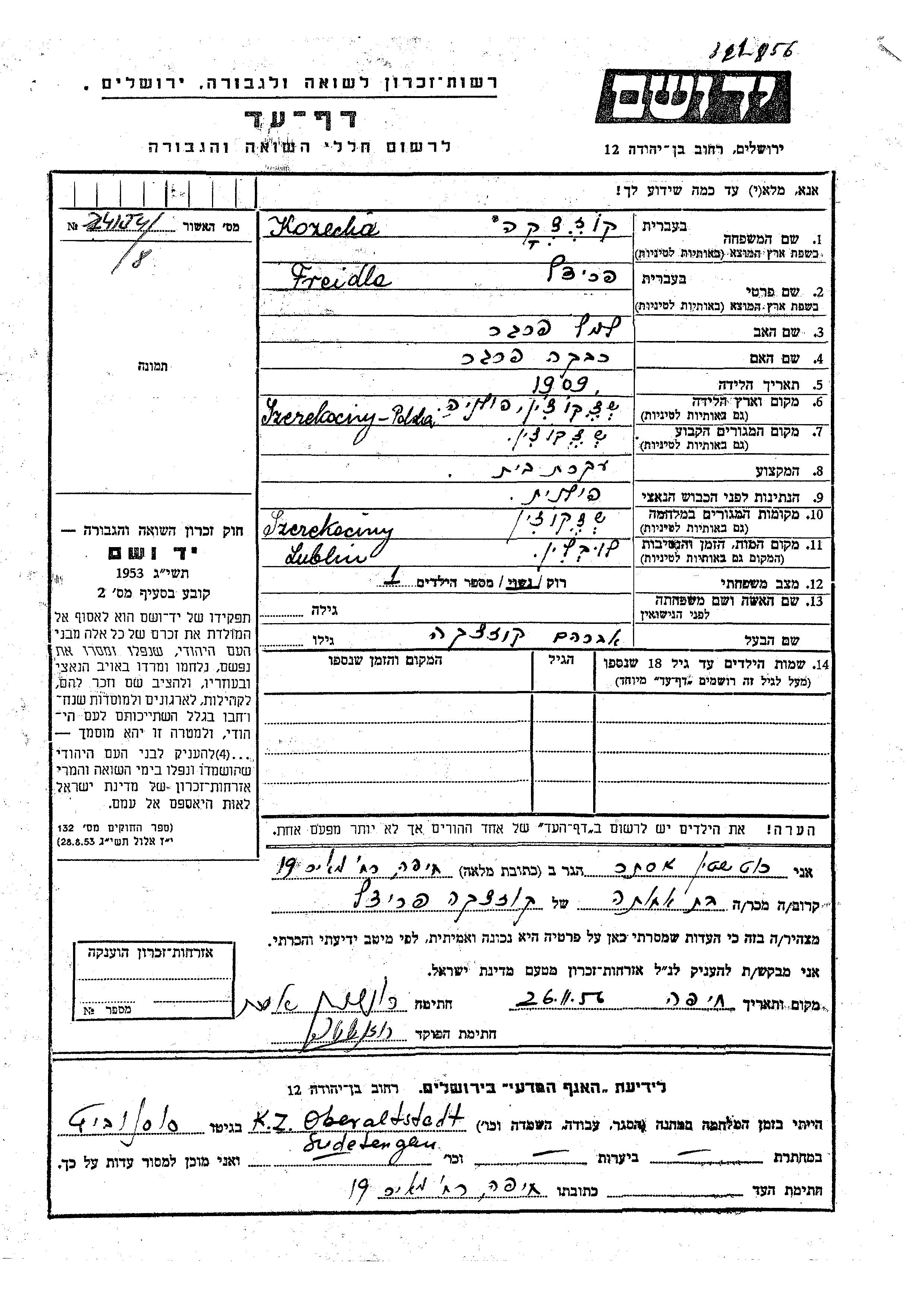Freidla Fridl Kozecha wurde im Jahr 1909 in Szczekociny, Polen geboren. Sie war die Tochter von Lemel und Rivka. Sie war Hausfrau und mit Avraham Verheiratet. Vor dem Zweiten Weltkrieg lebte sie in Szczekociny, Polen. Während des Krieges war sie in Szczekociny, Polen.