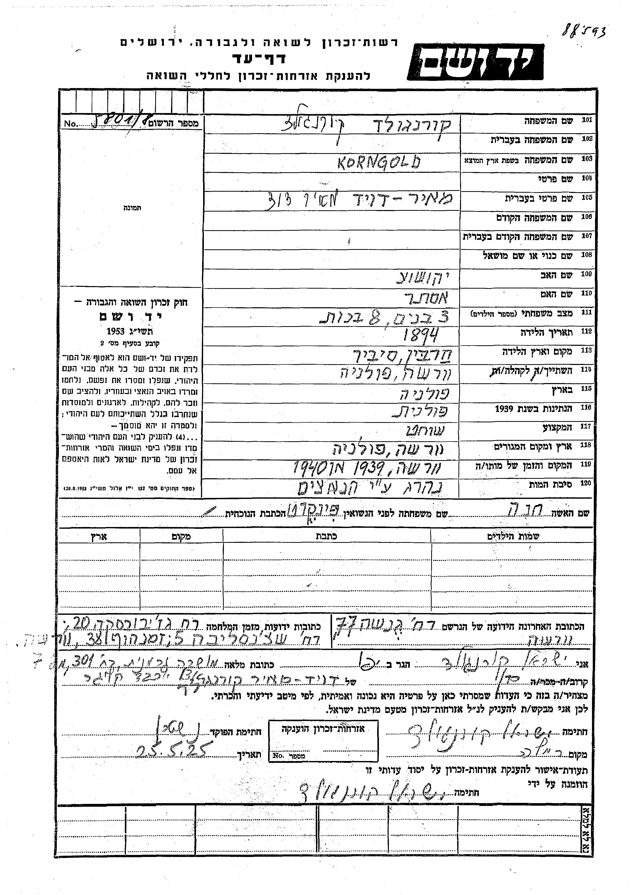 Meir David Korngold wurde im Jahr 1894 in Kharbin, China geboren. Er war der Sohn von Yehoshua und Ester. Er war Schächter. Vor dem Zweiten Weltkrieg lebte er in Warsaw, Polen. Während des Krieges war er in Warsaw, Polen.