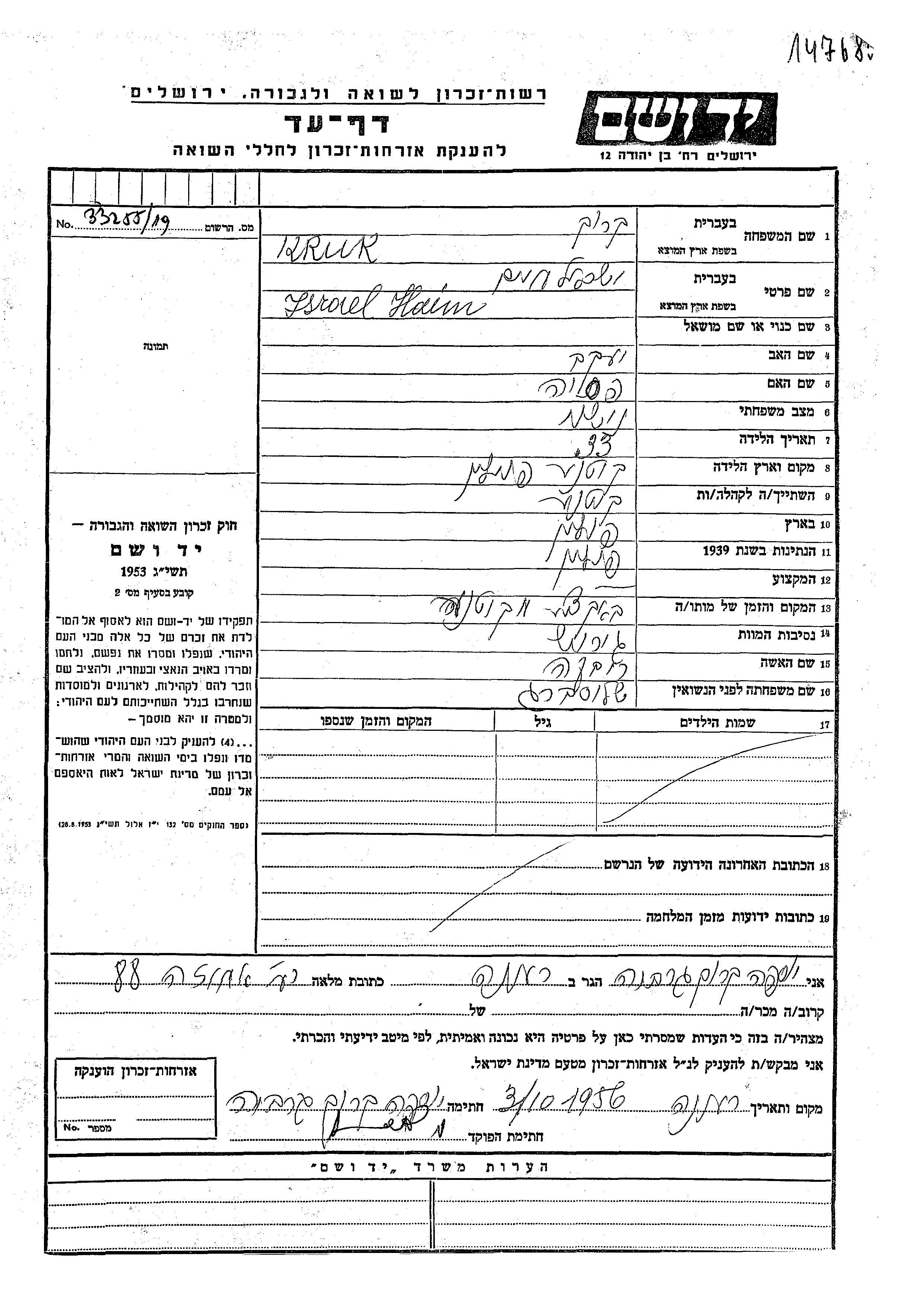 Ysrael Haim wurde in der Schoah ermordet. Todesort: Kutno, Polen.