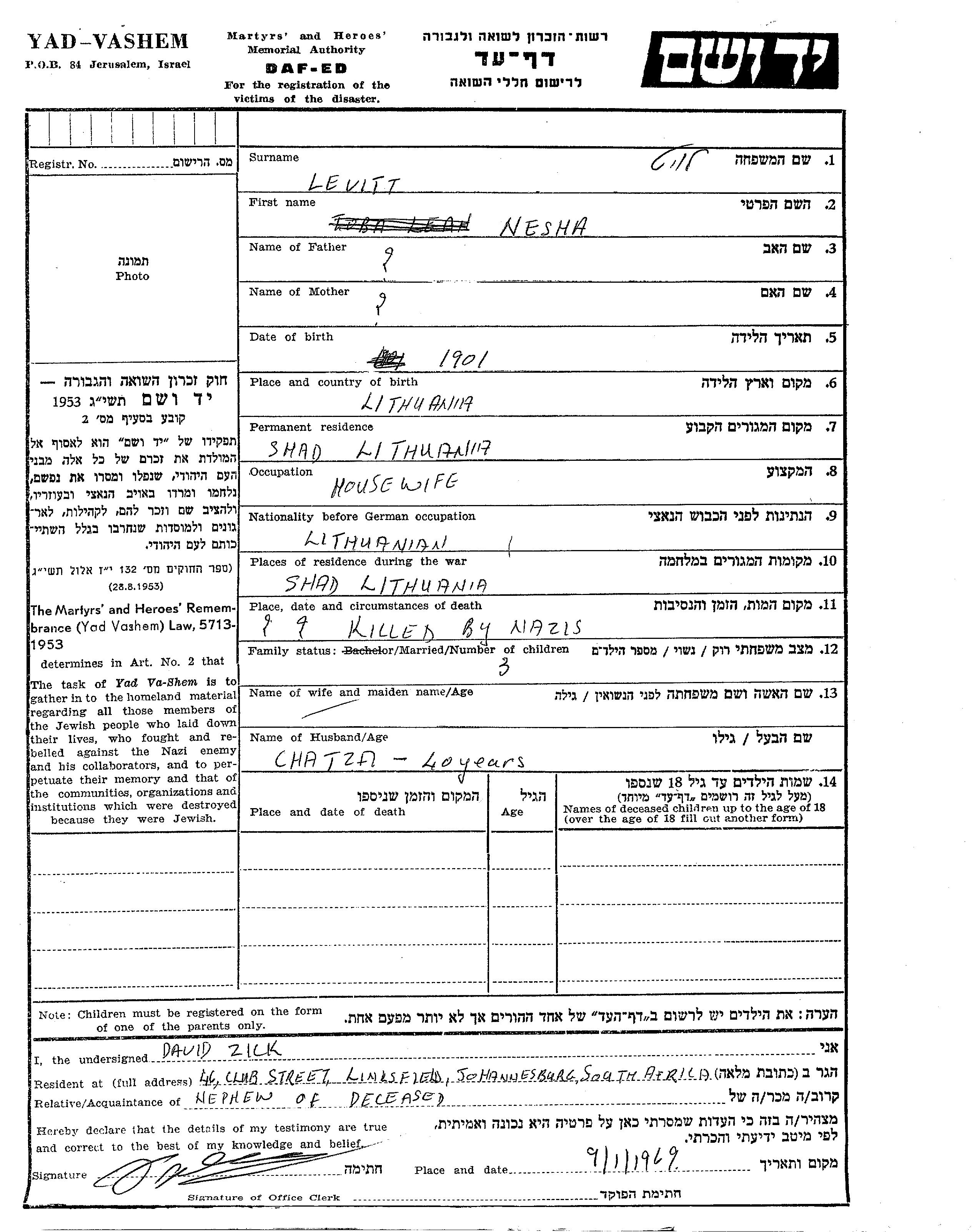 Nesha Levitt wurde im Jahr 1901 in Litauen geboren. Sie war Hausfrau und mit Chatza Verheiratet. Vor dem Zweiten Weltkrieg lebte sie in Shad, Litauen. Während des Krieges war sie in Shad, Litauen.