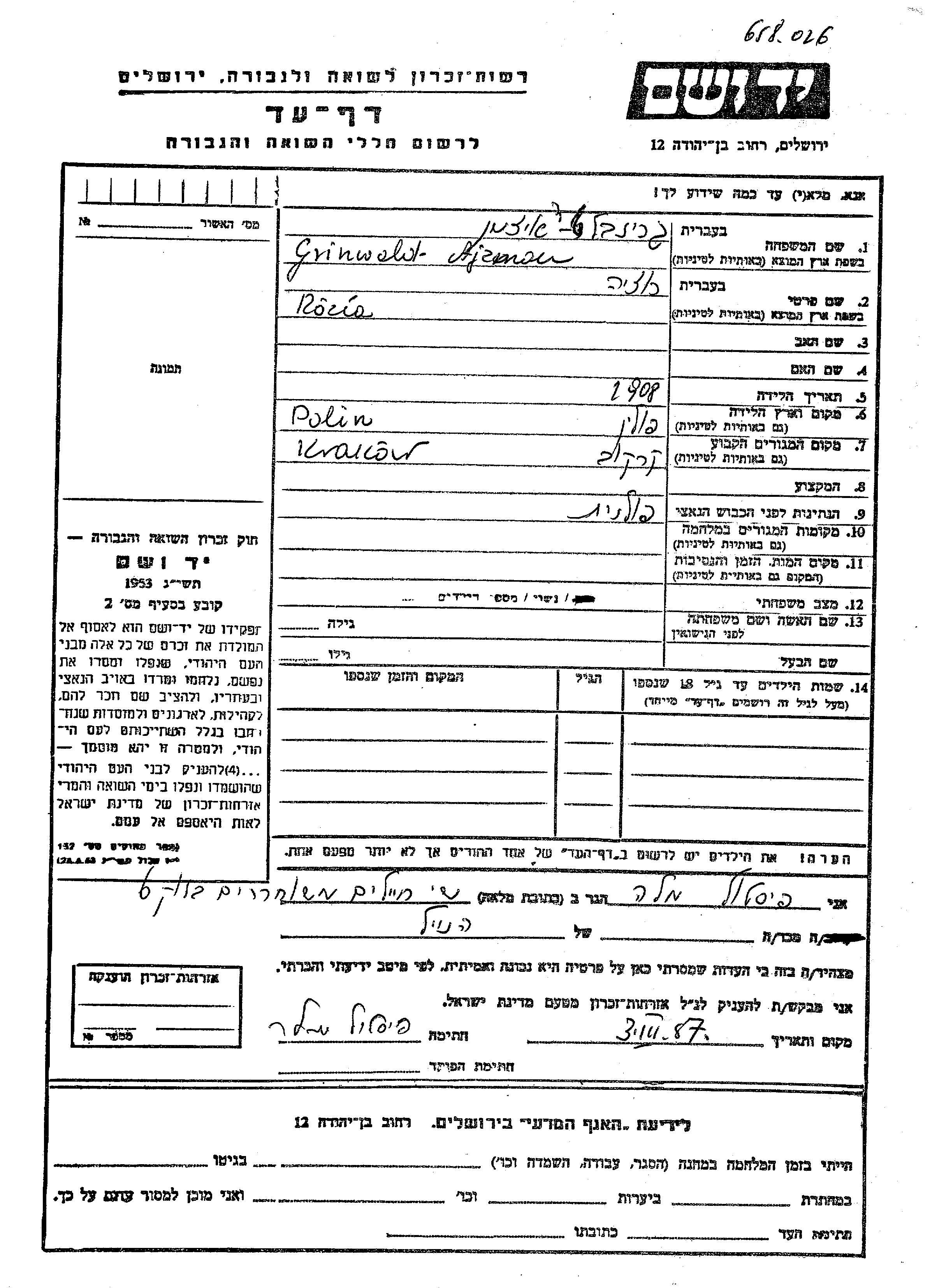 Rozia Grinwald Grinblat, geb. Ajzman wurde im Jahr 1908 in Polen geboren. Sie war Verheiratet. Vor dem Zweiten Weltkrieg lebte sie in Krakow, Polen.