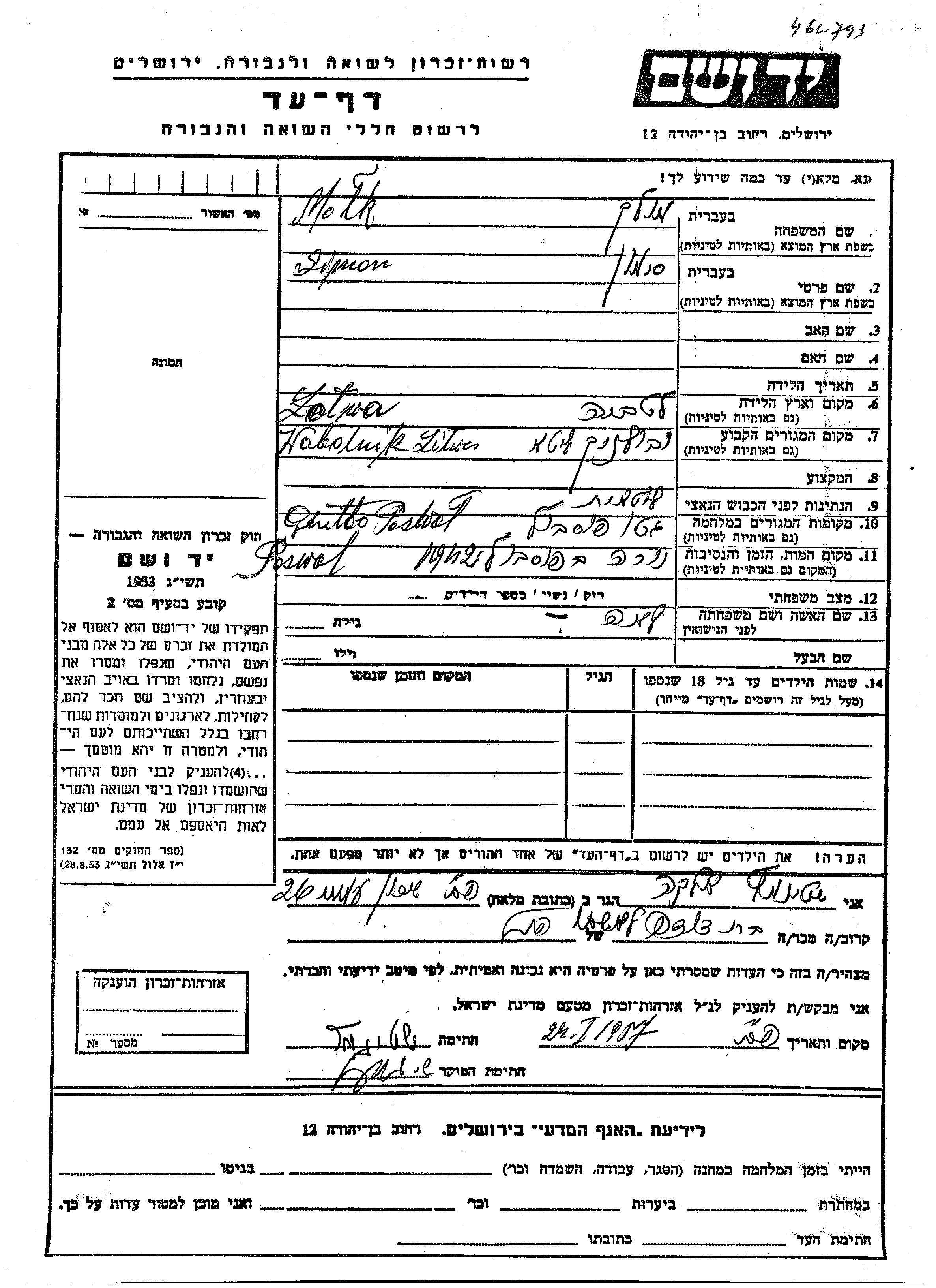 Molk Molek Solomon Vobolnik, Litauen Gedenkblatt