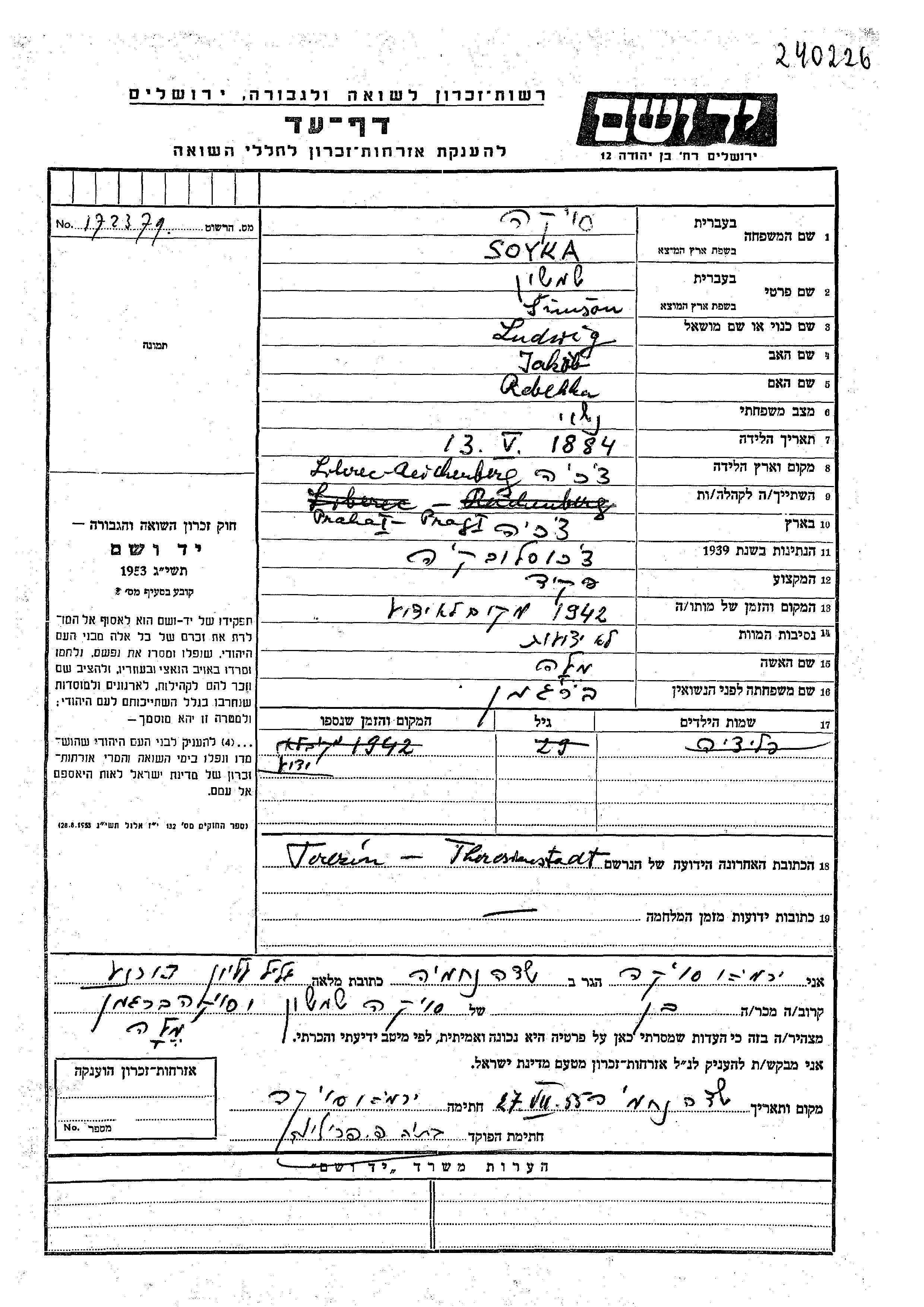 Shimshon Ludwig Soyka wurde im Jahr 1884 in Reichenberg, Tschechoslowakei geboren. Er war der Sohn von Jakob und Rebekka. Er war Angestellte/-r und mit Mala, geb. Bergman Verheiratet. Vor dem Zweiten Weltkrieg lebte er in Praha, Tschechoslowakei.