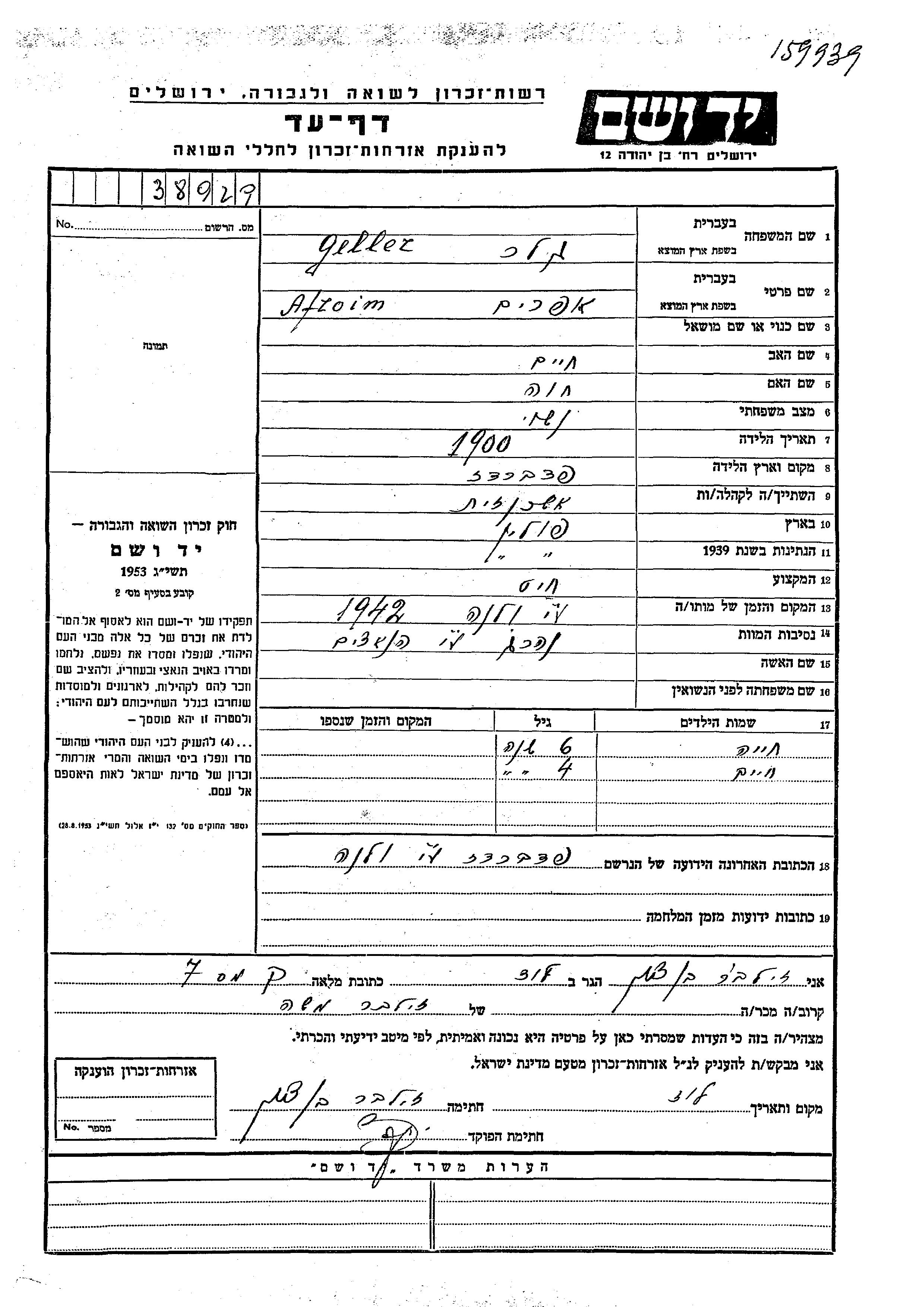 Afroim Geller wurde im Jahr 1900 in Podbrodzie, Polen geboren. Er war der Sohn von Khaim und Khava. Er war Schneider und Verheiratet.