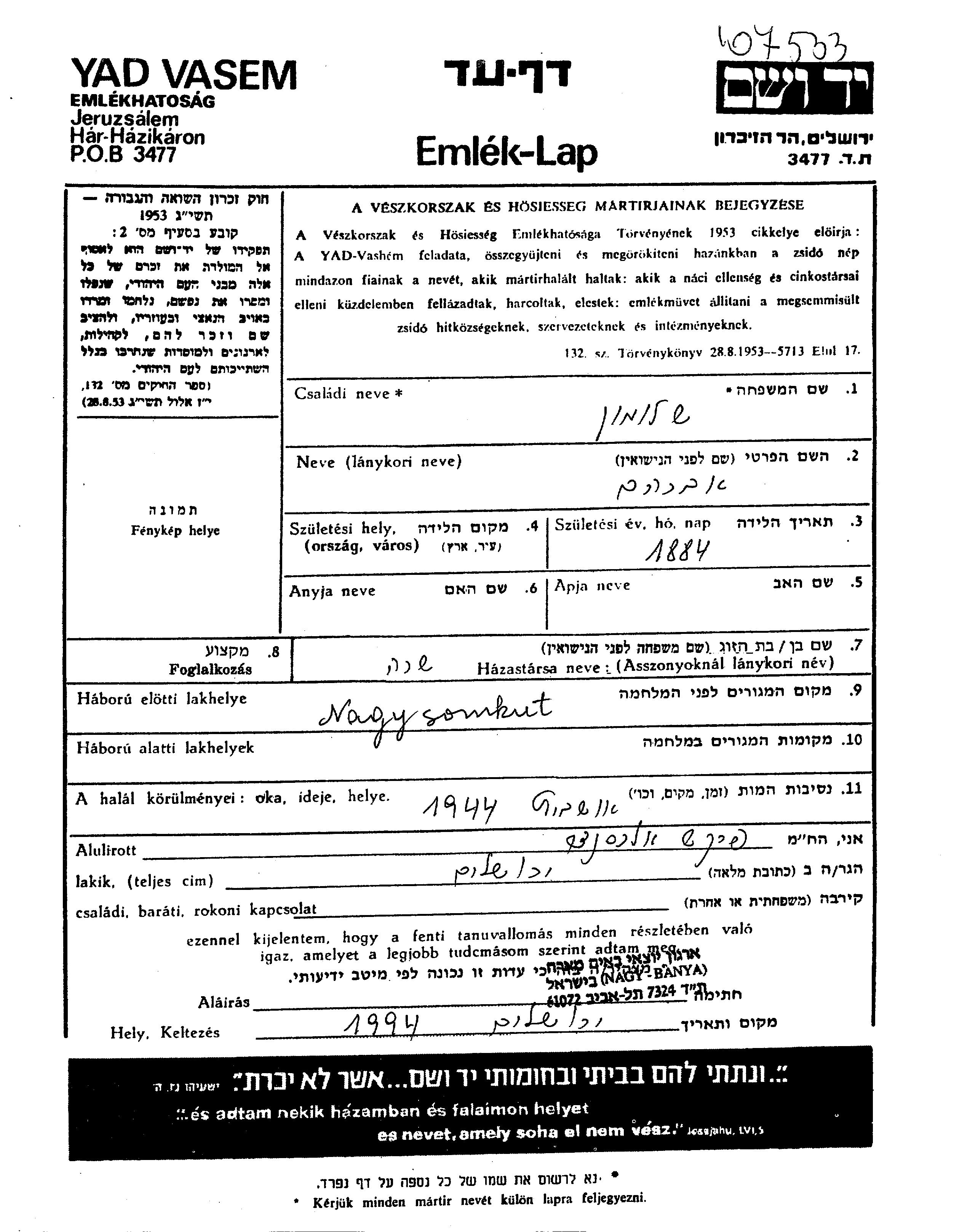 Avraham Menakhem Salomon wurde im Jahr 1885 in Nagysomkut, Rumänien geboren. Er war Hutmacher/-in. Vor dem Zweiten Weltkrieg lebte er in Nagysomkut, Rumänien.