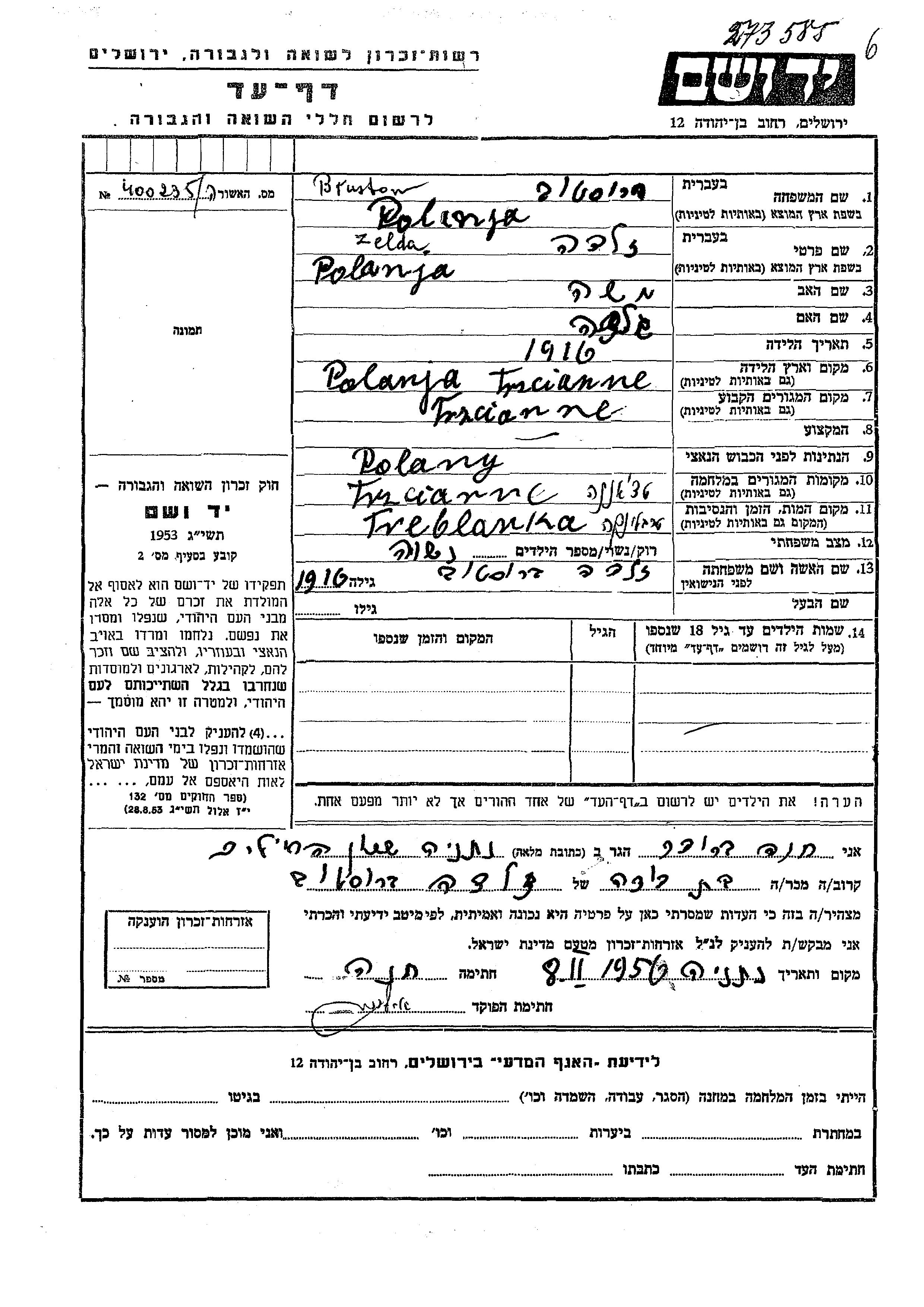 Zelda wurde in der Schoah ermordet. Todesort: Treblinka, Polen.