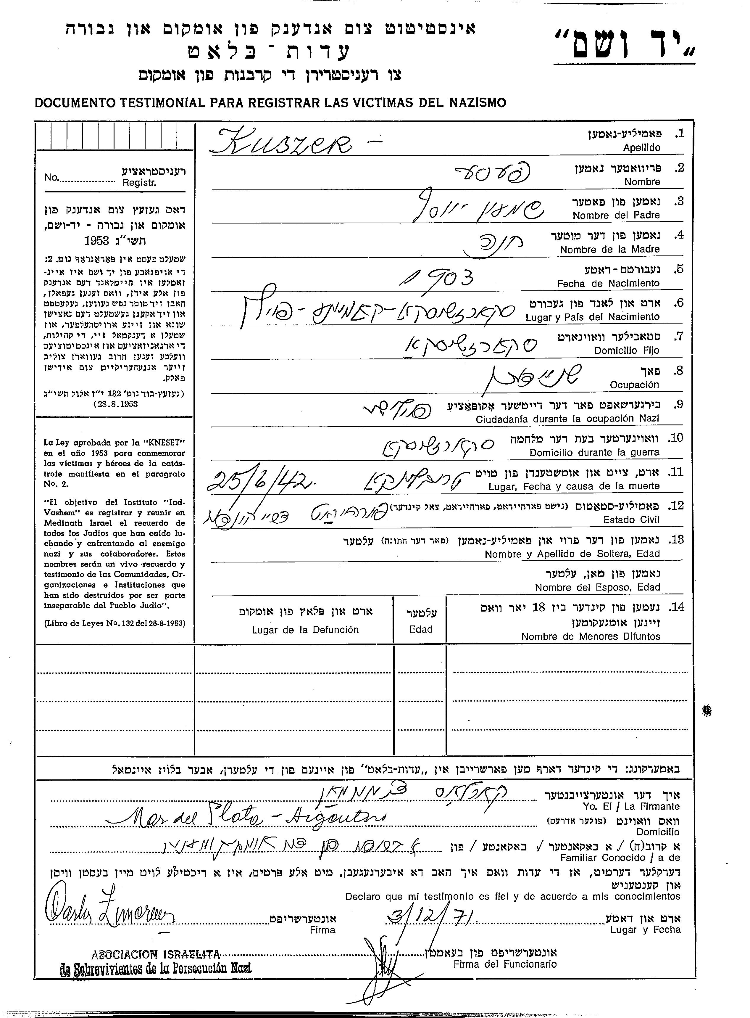 Pese Kuszer wurde im Jahr 1903 in Skarzysko Kamienna, Polen geboren. Sie war die Tochter von Shimon Yosef und Khana. Sie war Schneiderin und Verheiratet. Vor dem Zweiten Weltkrieg lebte sie in Skarzysko Kamienna, Polen. Während des Krieges war sie in Skarzysko Kamienna, Polen.