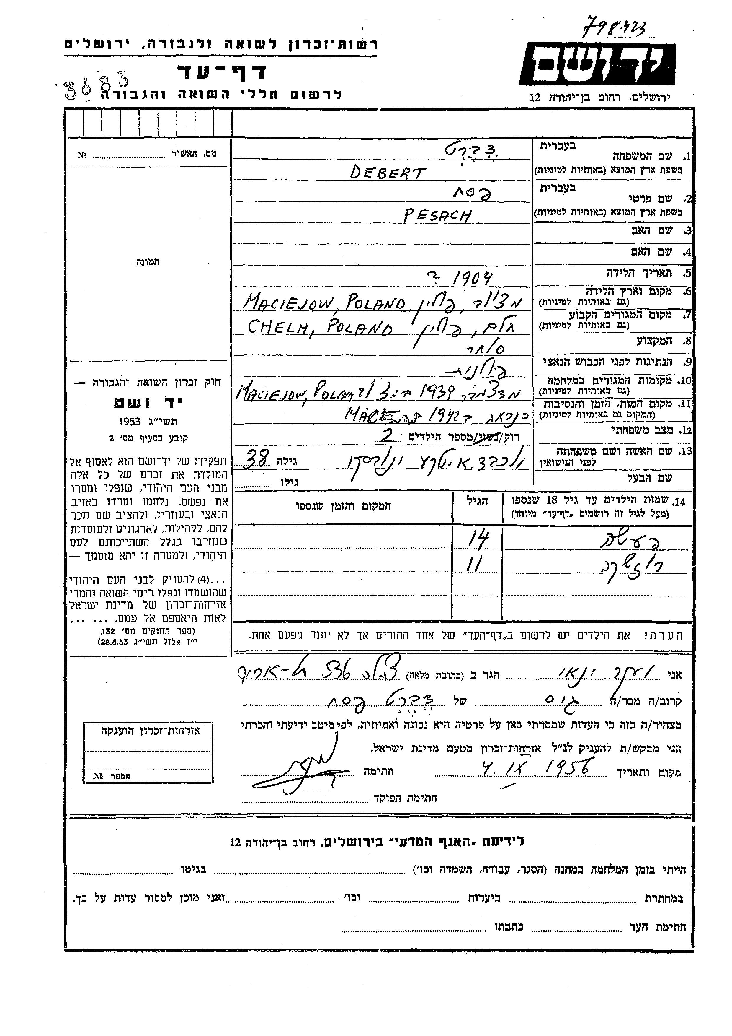 Pesach Debert wurde im Jahr 1904 in Maciejow, Polen geboren. Er war Kaufmann/-frau. Vor dem Zweiten Weltkrieg lebte er in Chelm, Polen. Während des Krieges war er in Maciejow, Polen.
