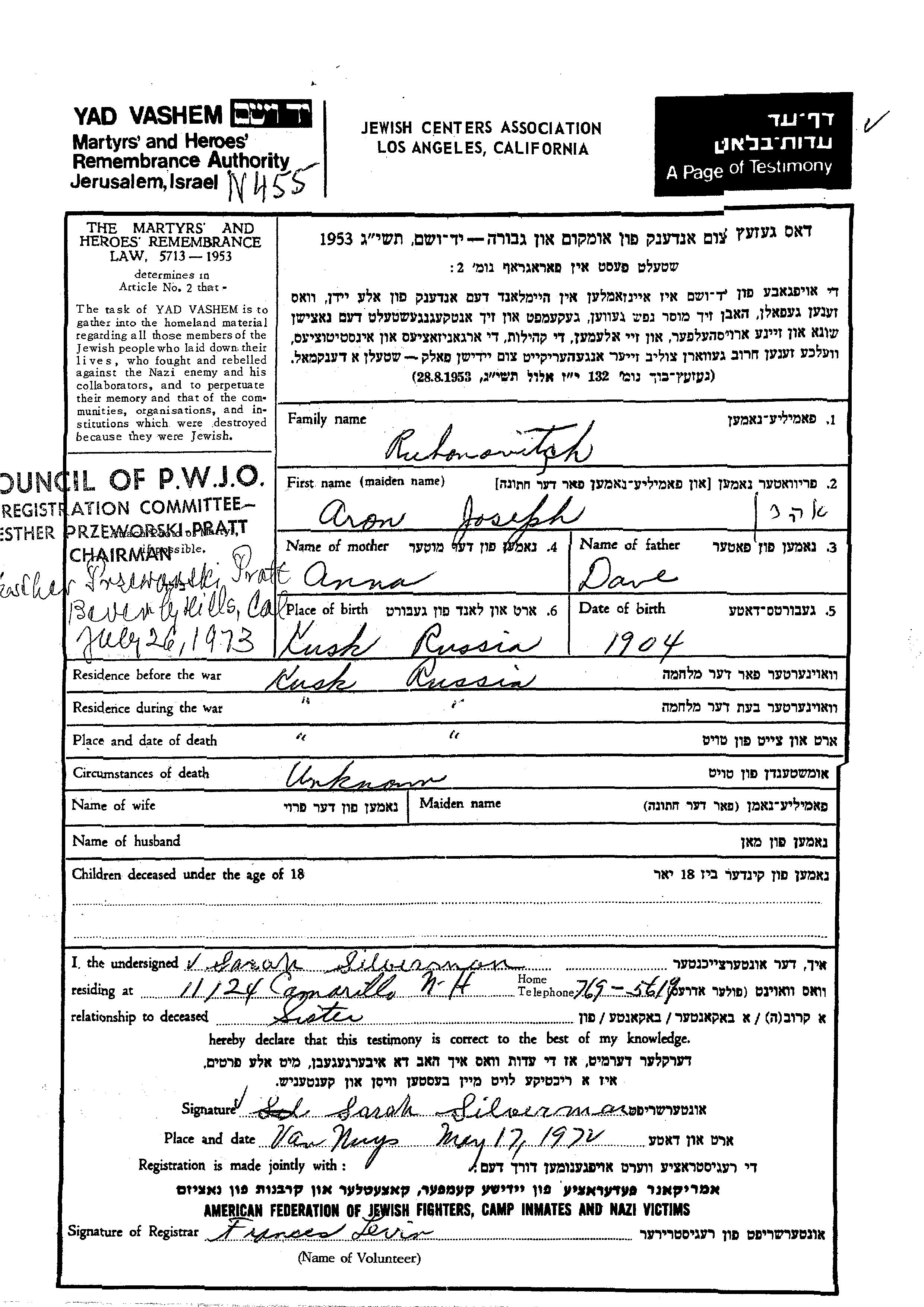 Name unbekannt Aron Joseph 1904 Kush Yelga, Russland (UdSSR) Gedenkblatt
