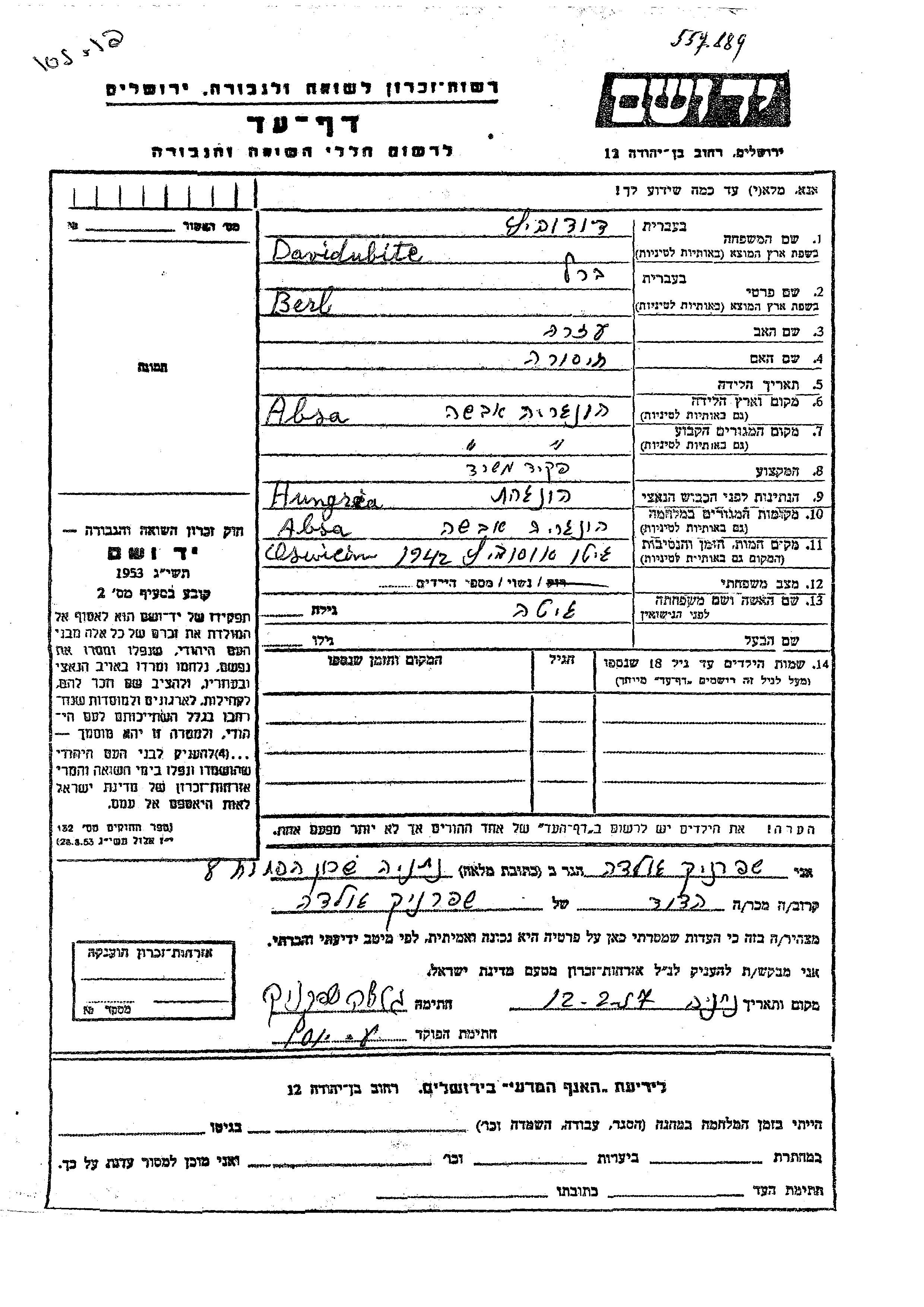 Berl Davidubitc wurde in Apsa, Tschechoslowakei geboren. Er war der Sohn von Ezra und Khaisora. Er war Angestellte/-r und mit Gita Verheiratet. Vor dem Zweiten Weltkrieg lebte er in Apsa, Tschechoslowakei. Während des Krieges war er in Apsa, Tschechoslowakei.