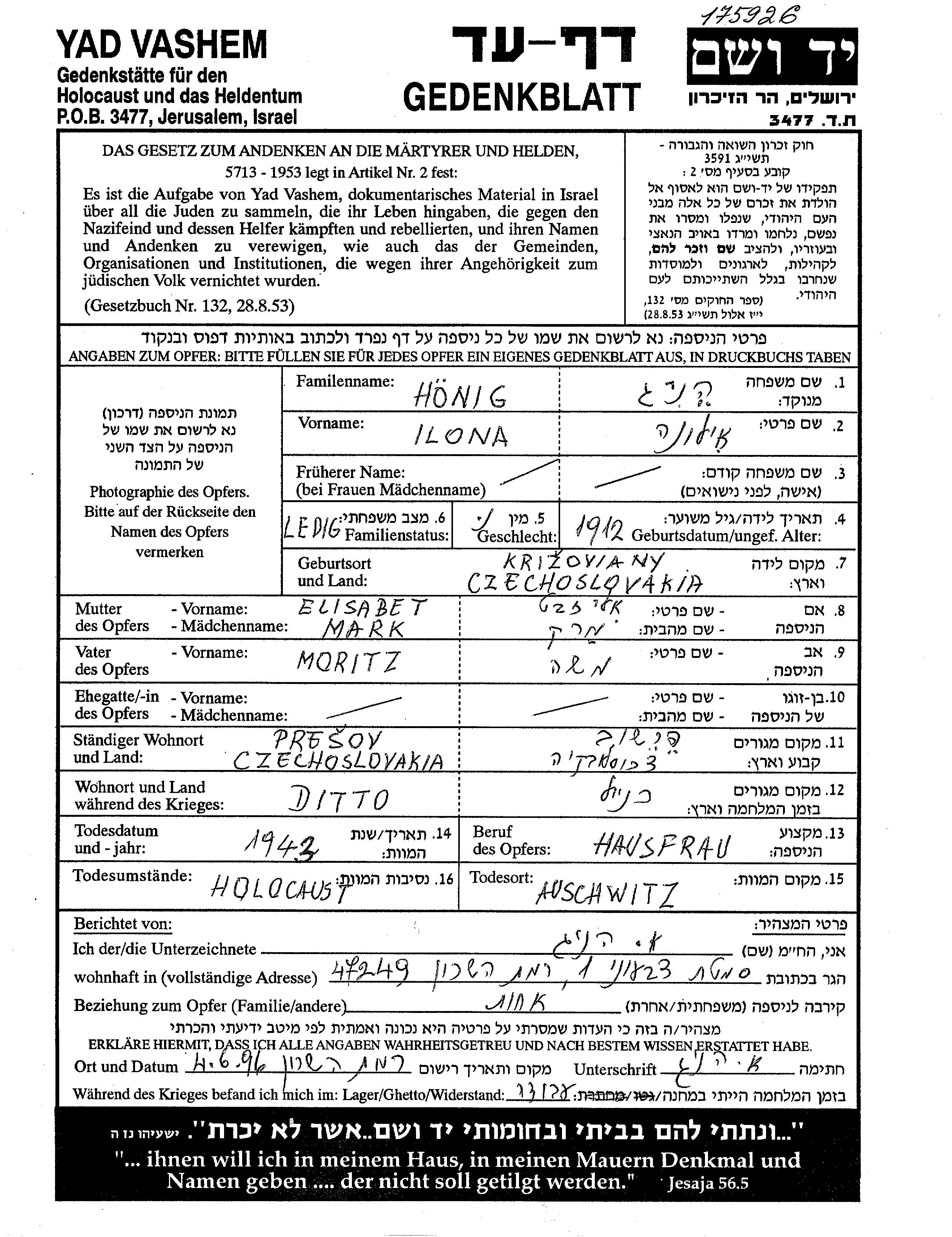 Ilona Hönig wurde im Jahr 1912 in Krizoviany, Tschechoslowakei geboren. Sie war die Tochter von Moshe Moritz und Elisabet, geb. Mark. Sie war Hausfrau und Ledig. Vor dem Zweiten Weltkrieg lebte sie in Presov, Tschechoslowakei. Während des Krieges war sie in Presov, Tschechoslowakei.