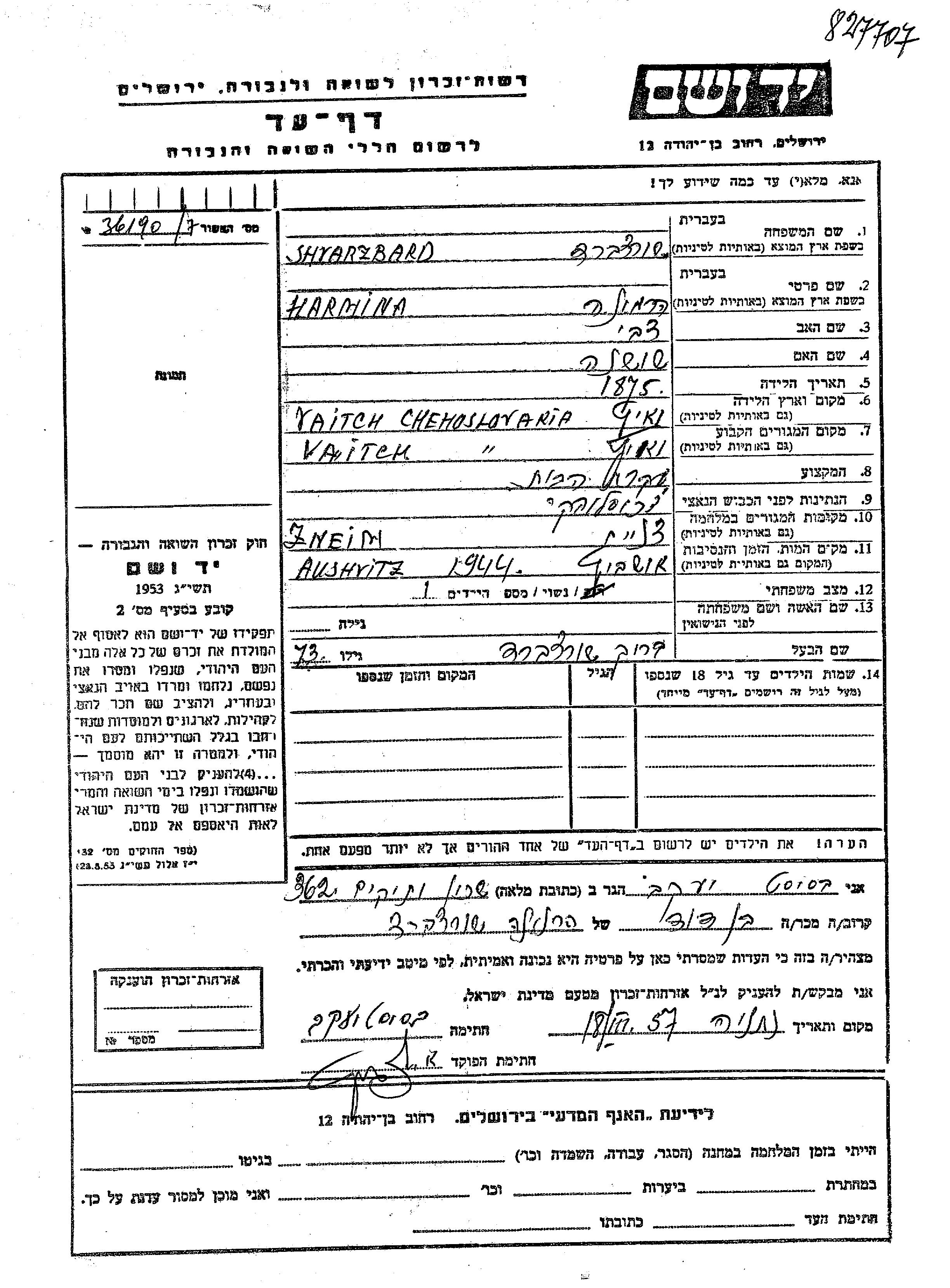 Harmina Shvarzbard wurde im Jahr 1875 in Vac, Ungarn geboren. Sie war die Tochter von Tzvi und Shoshana. Sie war Hausfrau und mit Barukh Verheiratet. Vor dem Zweiten Weltkrieg lebte sie in Vac, Ungarn. Während des Krieges war sie in Znojmo, Tschechoslowakei.