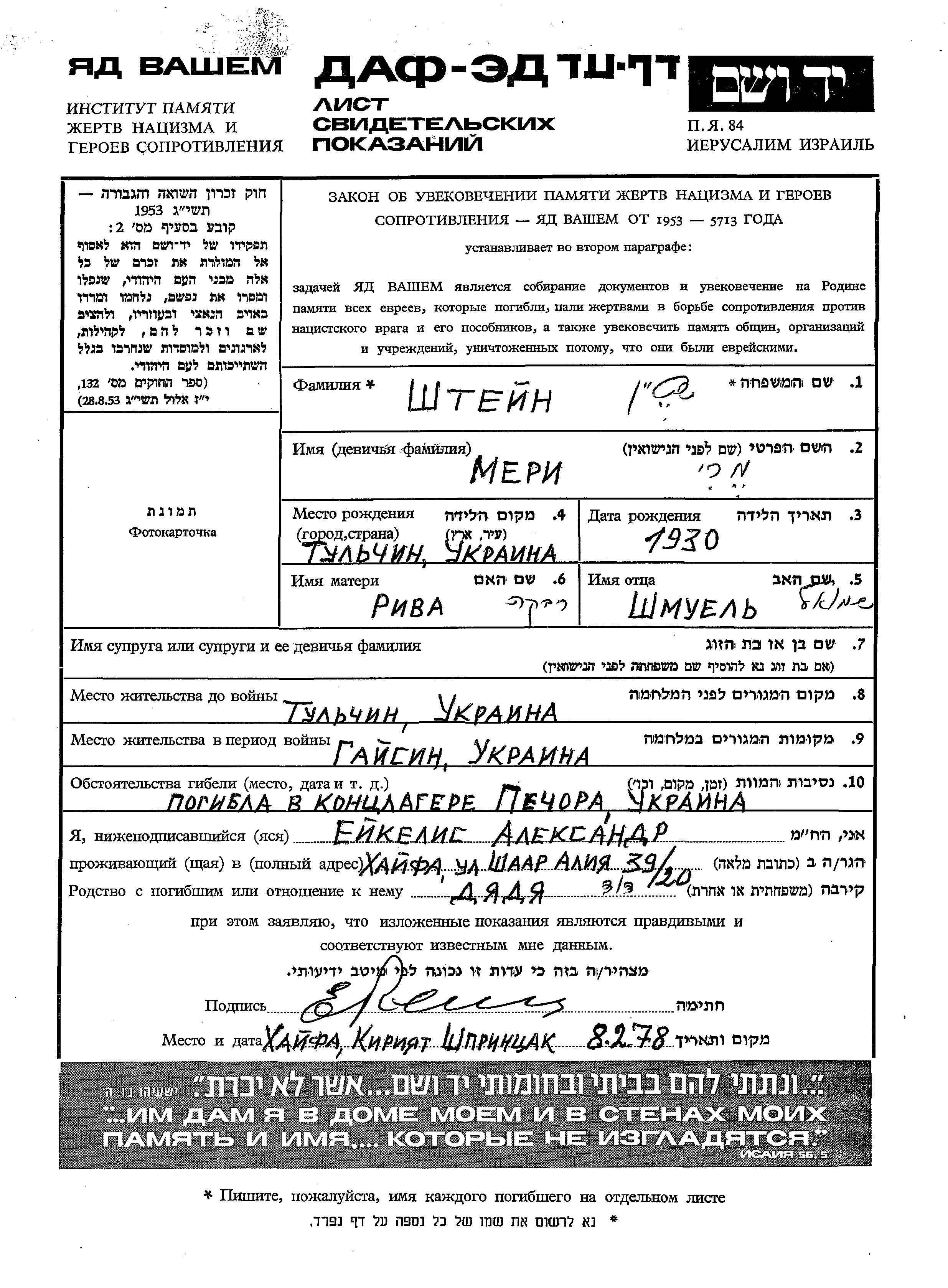 Mari Stein wurde im Jahr 1930 in Tulchin, Ukraine (UdSSR) geboren. Sie war die Tochter von Shmuel und Riva. Sie war Kind. Vor dem Zweiten Weltkrieg lebte sie in Tulchin, Ukraine (UdSSR). Während des Krieges war sie in Gaisin, Ukraine (UdSSR).