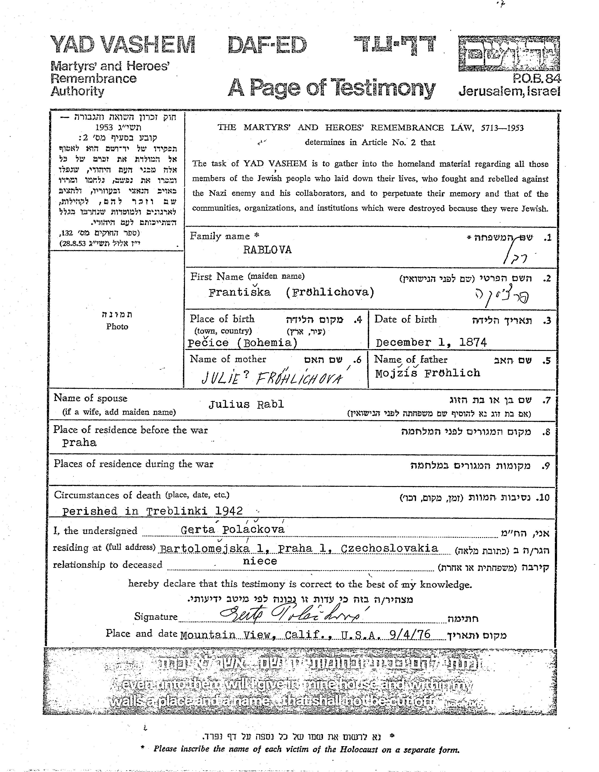 Frantiska Rablova, geb. Frohlichova wurde im Jahr 1874 in Pecice, Tschechoslowakei geboren. Vor dem Zweiten Weltkrieg lebte sie in Praha, Tschechoslowakei.