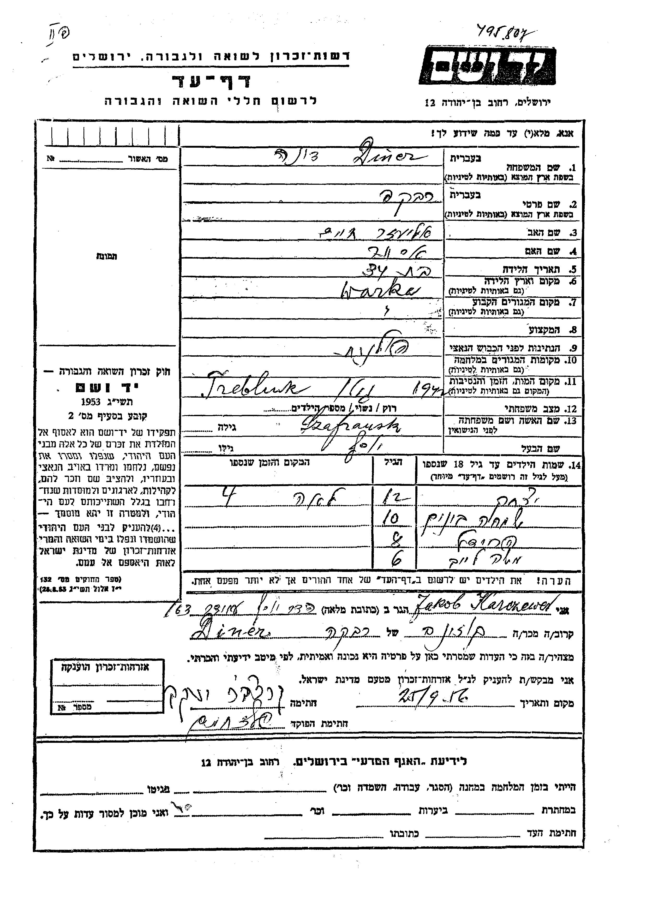 Rivka Diner, geb. Szafranska wurde in Warsaw, Polen geboren. Sie war die Tochter von Eliezer Khaim und Ester. Sie war mit Yosef Verheiratet.