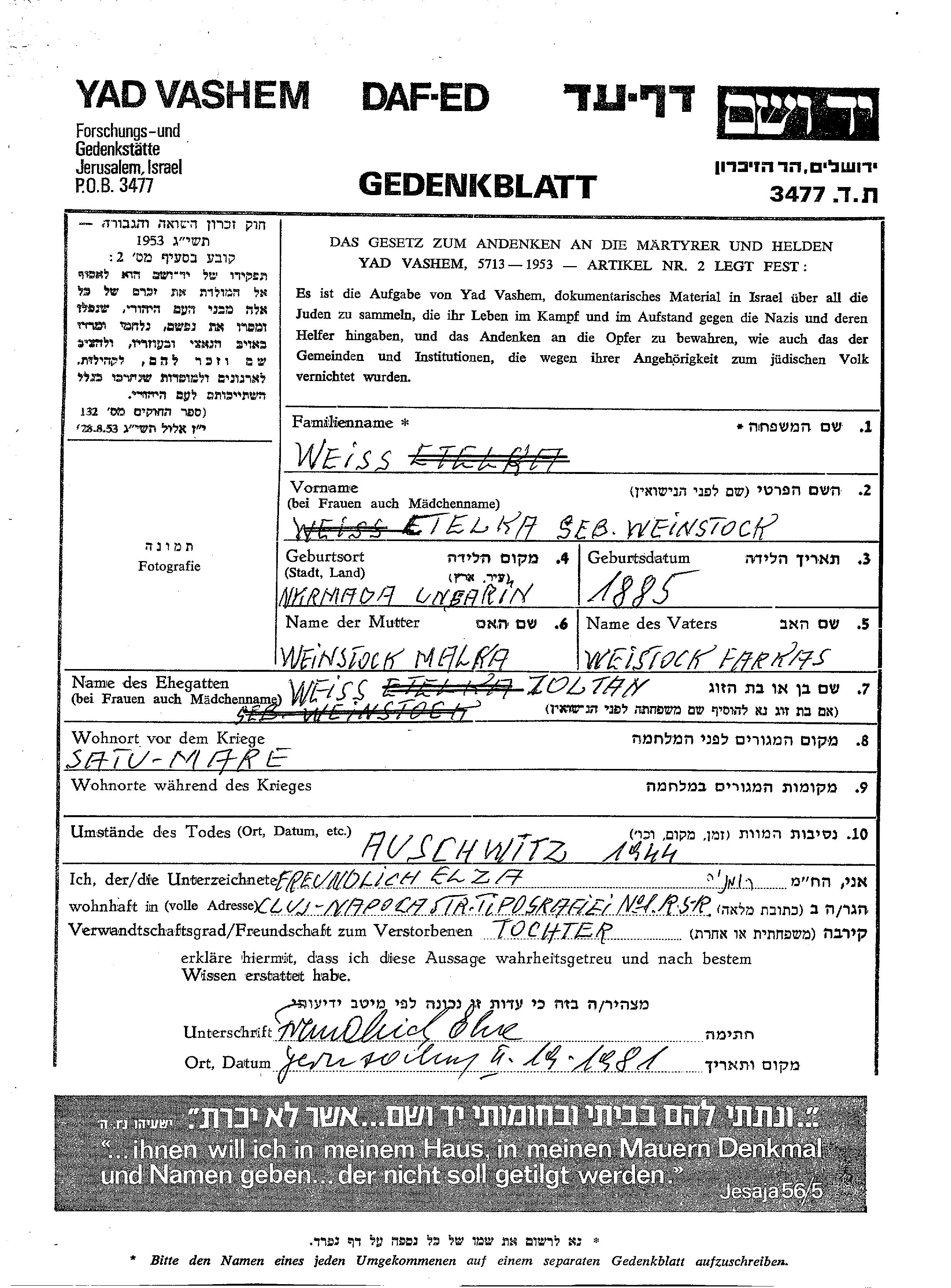 Etelka Weiss, geb. Weinstock wurde im Jahr 1885 in Nyirmada, Ungarn geboren. Vor dem Zweiten Weltkrieg lebte sie in Satu Mare, Rumänien.