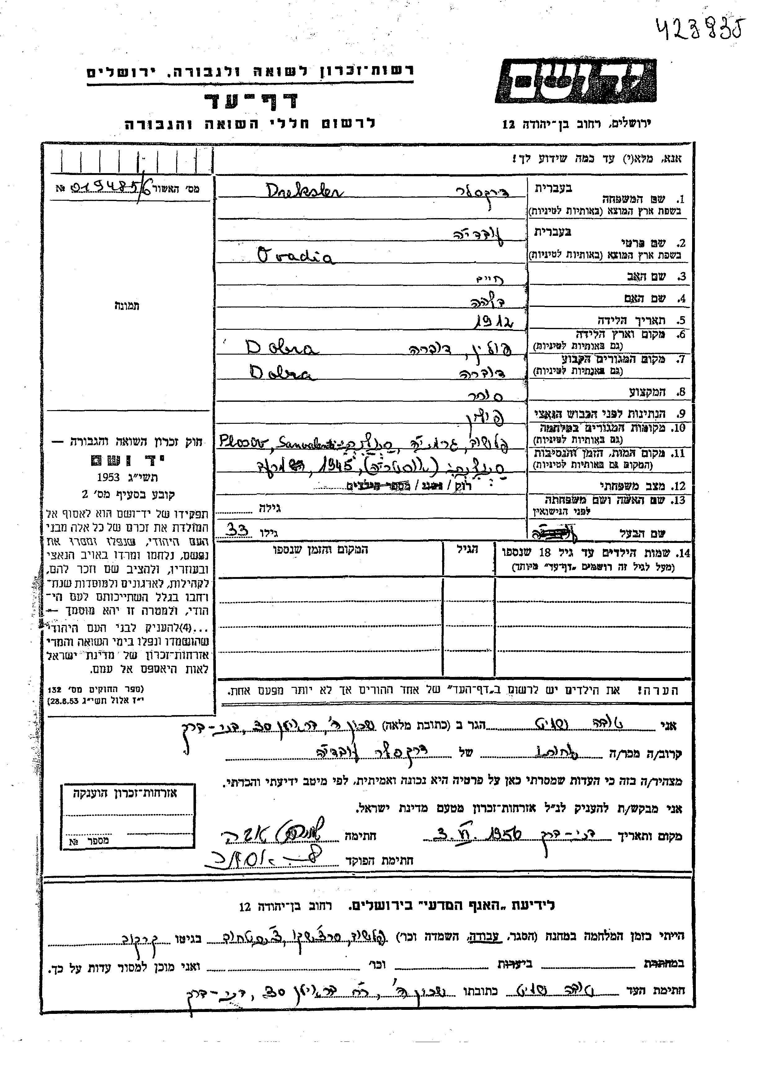 Ovadia Dreksler wurde im Jahr 1912 in Dobra, Polen geboren. Er war der Sohn von Khaim und Bilha. Er war Kaufmann/-frau und Ledig. Vor dem Zweiten Weltkrieg lebte er in Dobra, Polen.