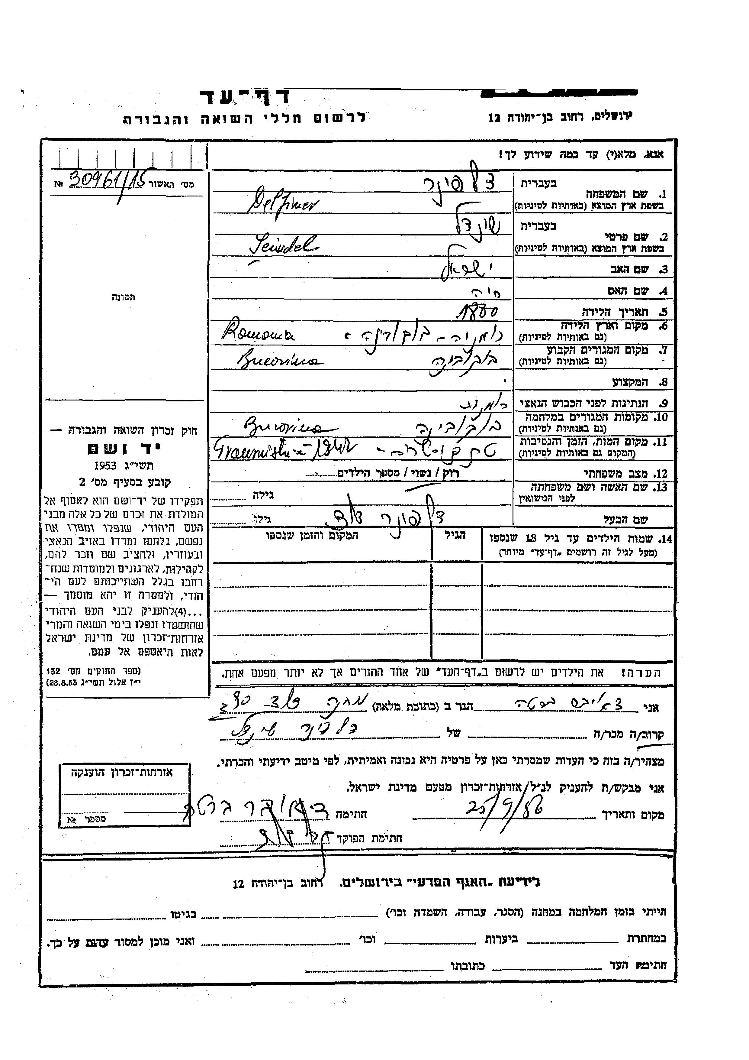 Seindel Delfiner wurde im Jahr 1880 in Bukovina, Rumänien geboren. Sie war die Tochter von Yisrael und Khaia. Sie war mit David Verheiratet. Vor dem Zweiten Weltkrieg lebte sie in Bukovina, Rumänien. Während des Krieges war sie in Bukovina, Rumänien.
