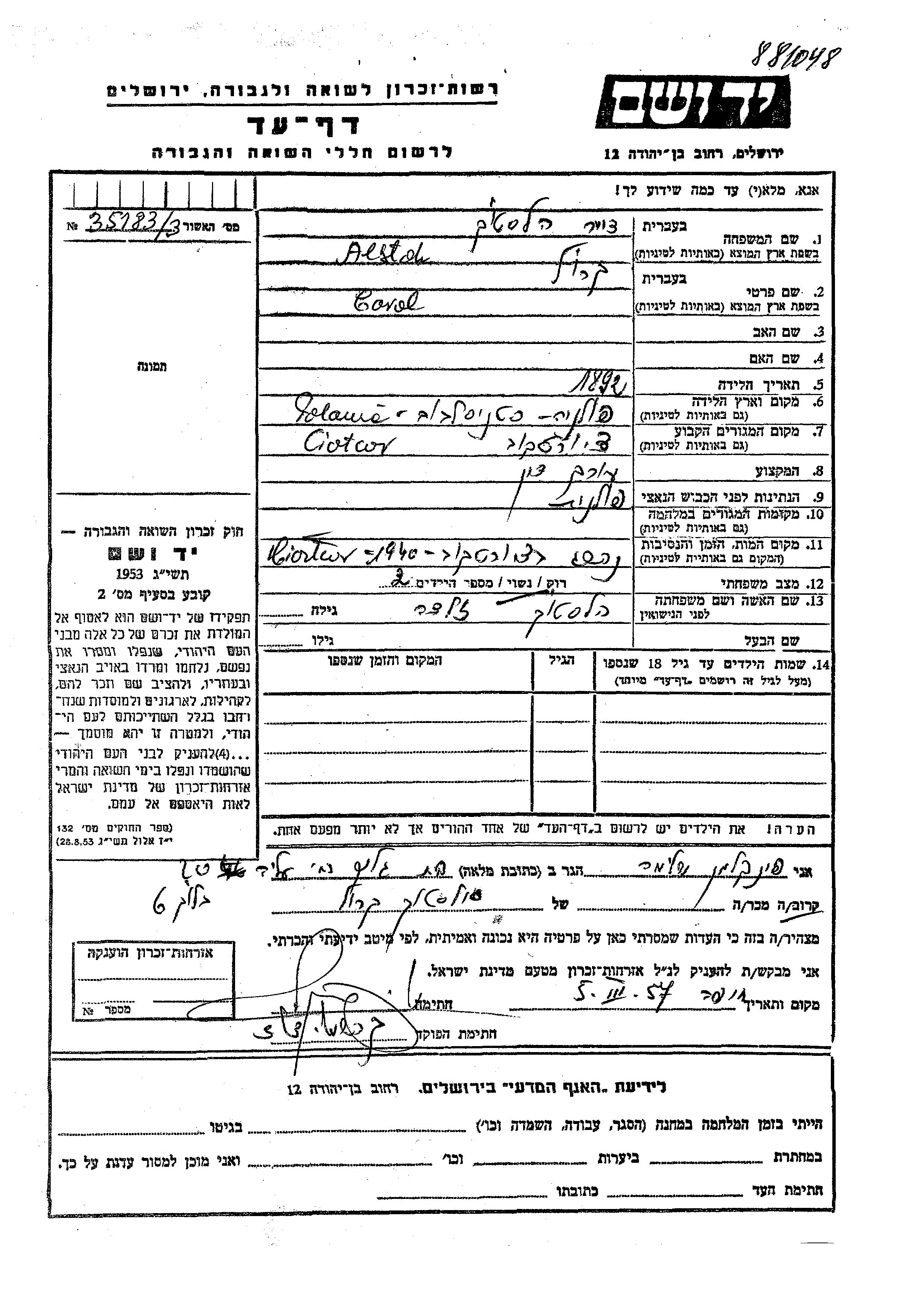 Dr. Alstok wurde in der Schoah ermordet. Todesort: Czortkow, Polen im Jahr 1940.