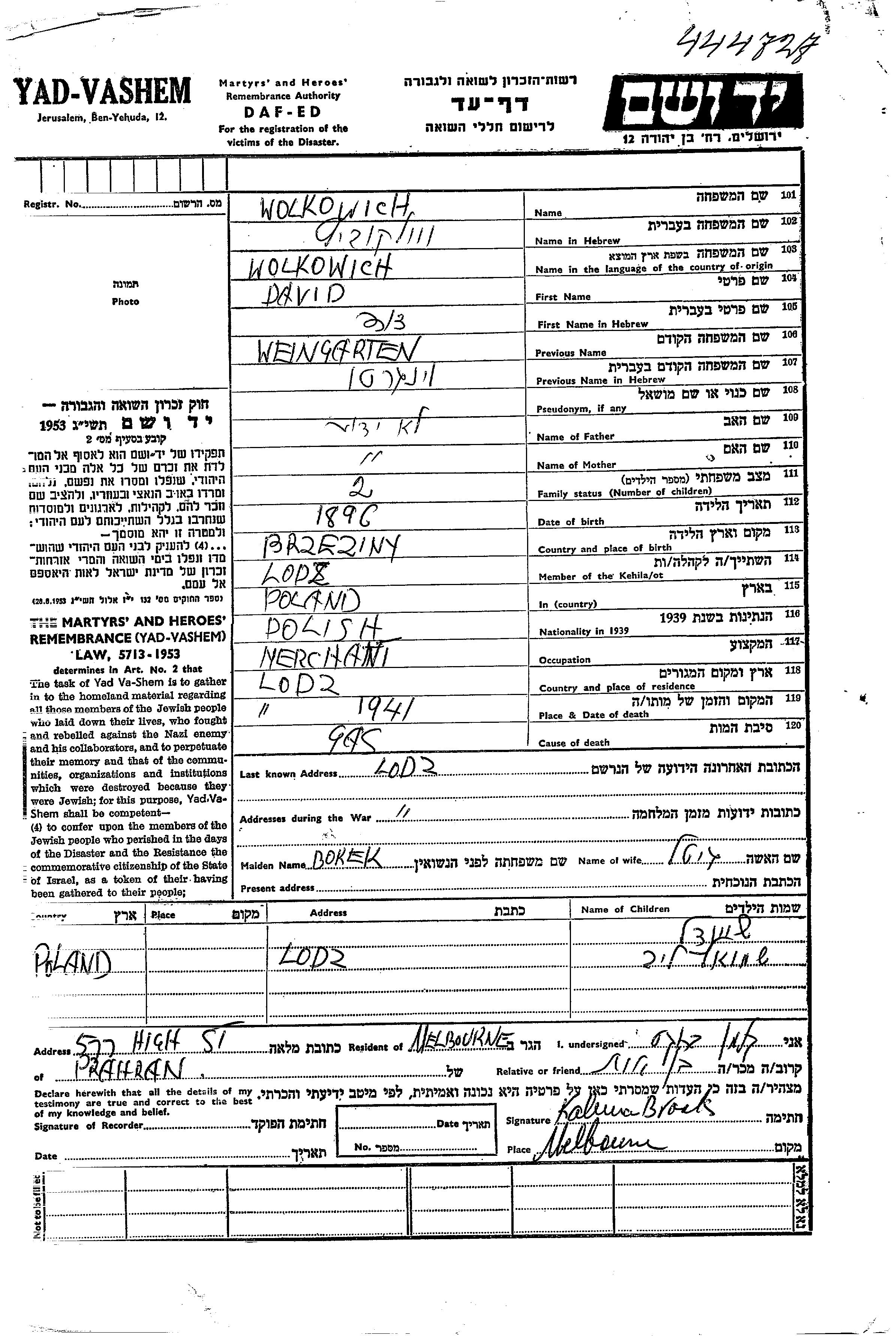 David Wolkowich Weingarten wurde im Jahr 1896 in Brzeziny, Polen geboren. Er war Kaufmann/-frau und mit Gitel, geb. Bokek Verheiratet. Vor dem Zweiten Weltkrieg lebte er in Lodz, Polen. Während des Krieges war er in Lodz, Polen.