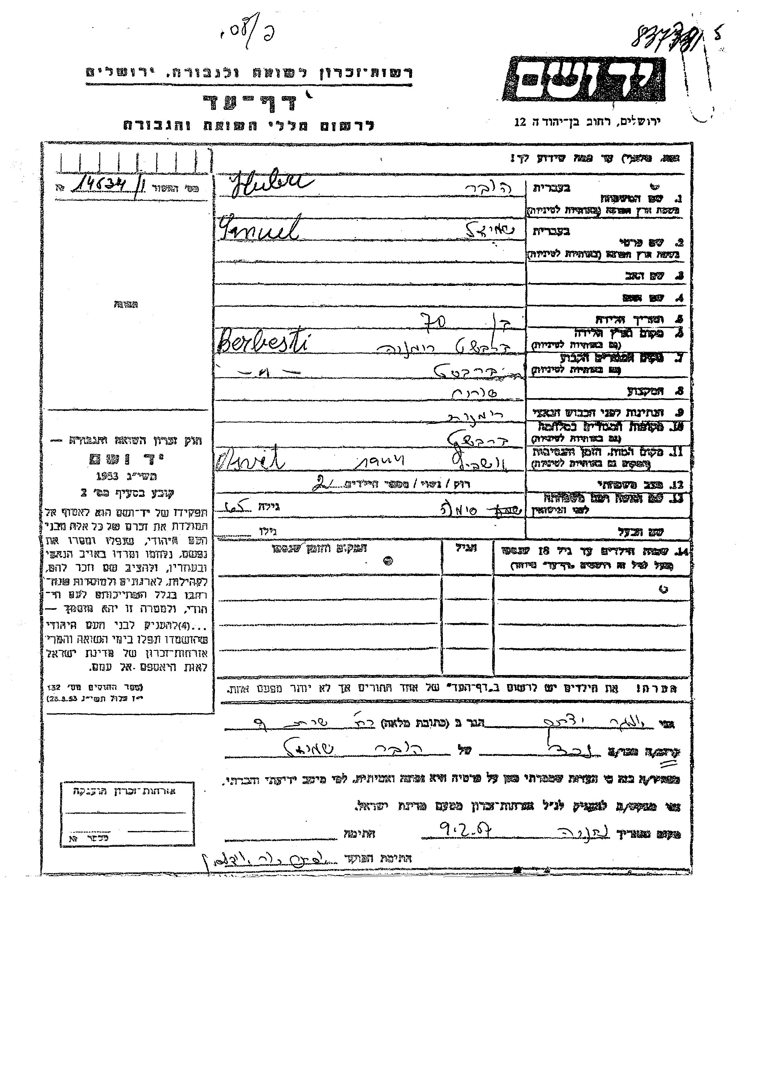Smul Huber wurde in Berbesti, Rumänien geboren. Er war mit Sima Verheiratet. Vor dem Zweiten Weltkrieg lebte er in Berbesti, Rumänien. Während des Krieges war er in Berbesti, Rumänien.