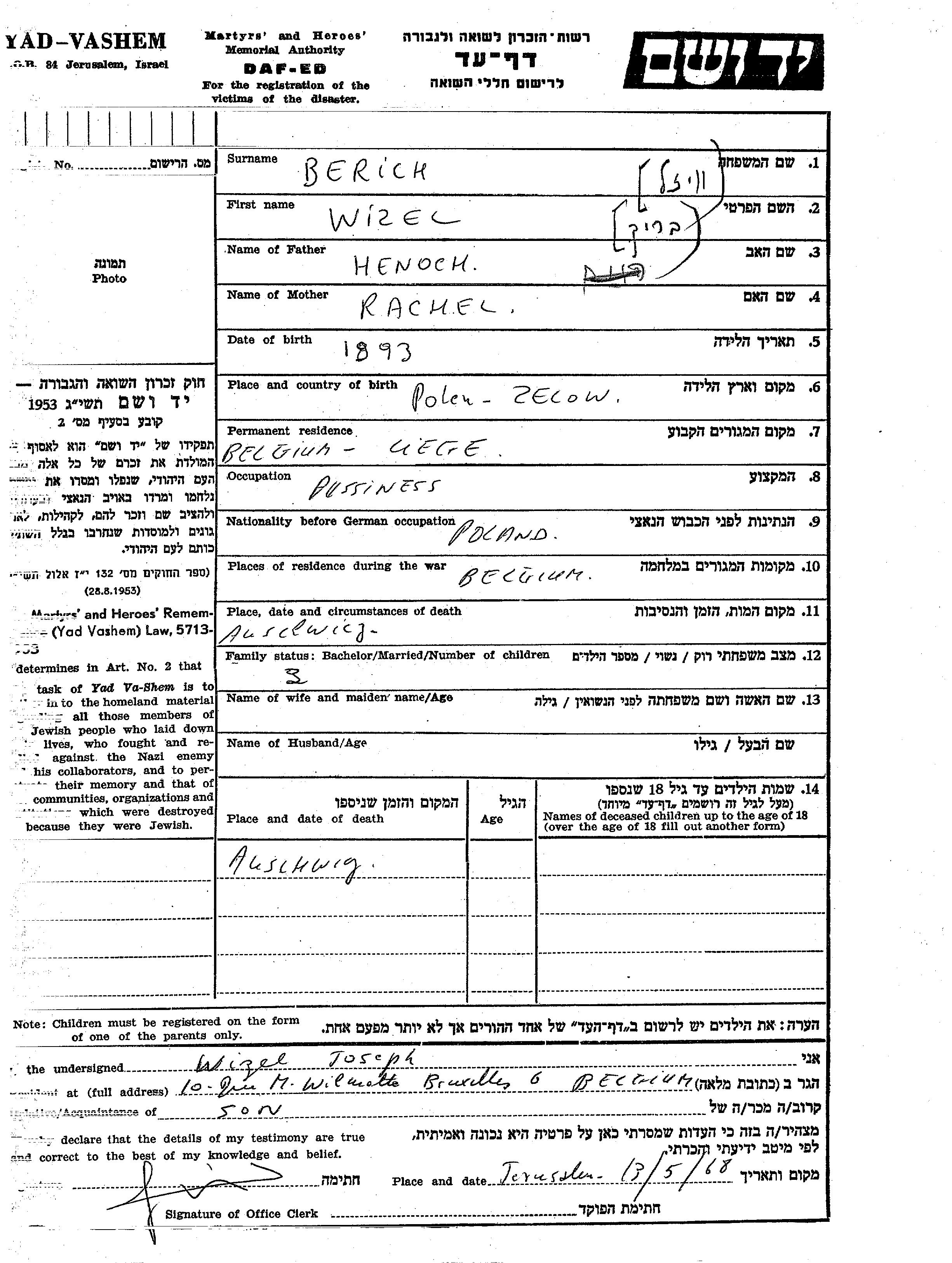 Berich Berikh Wizel wurde im Jahr 1893 in Zelow, Polen geboren. Er war der Sohn von Henoch und Rachel. Er war Verheiratet. Vor dem Zweiten Weltkrieg lebte er in Liege, Belgien. Während des Krieges war er in Belgien.
