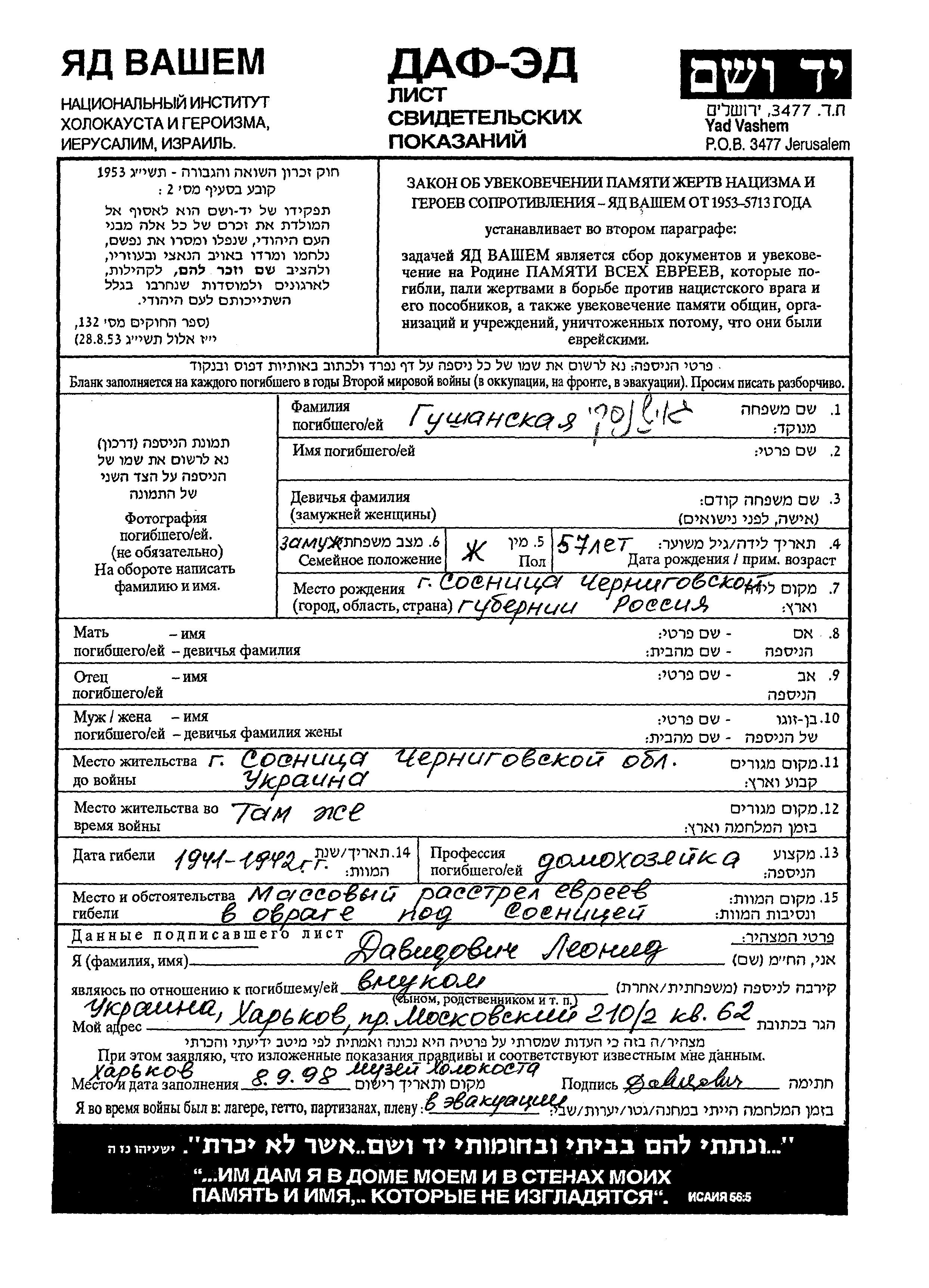 Vorname unbekannt Gushanskaya wurde in Sosnitza, Ukraine (UdSSR) geboren. Sie war Hausfrau und Verheiratet. Vor dem Zweiten Weltkrieg lebte sie in Sosnitza, Ukraine (UdSSR). Während des Krieges war sie in Sosnitza, Ukraine (UdSSR).