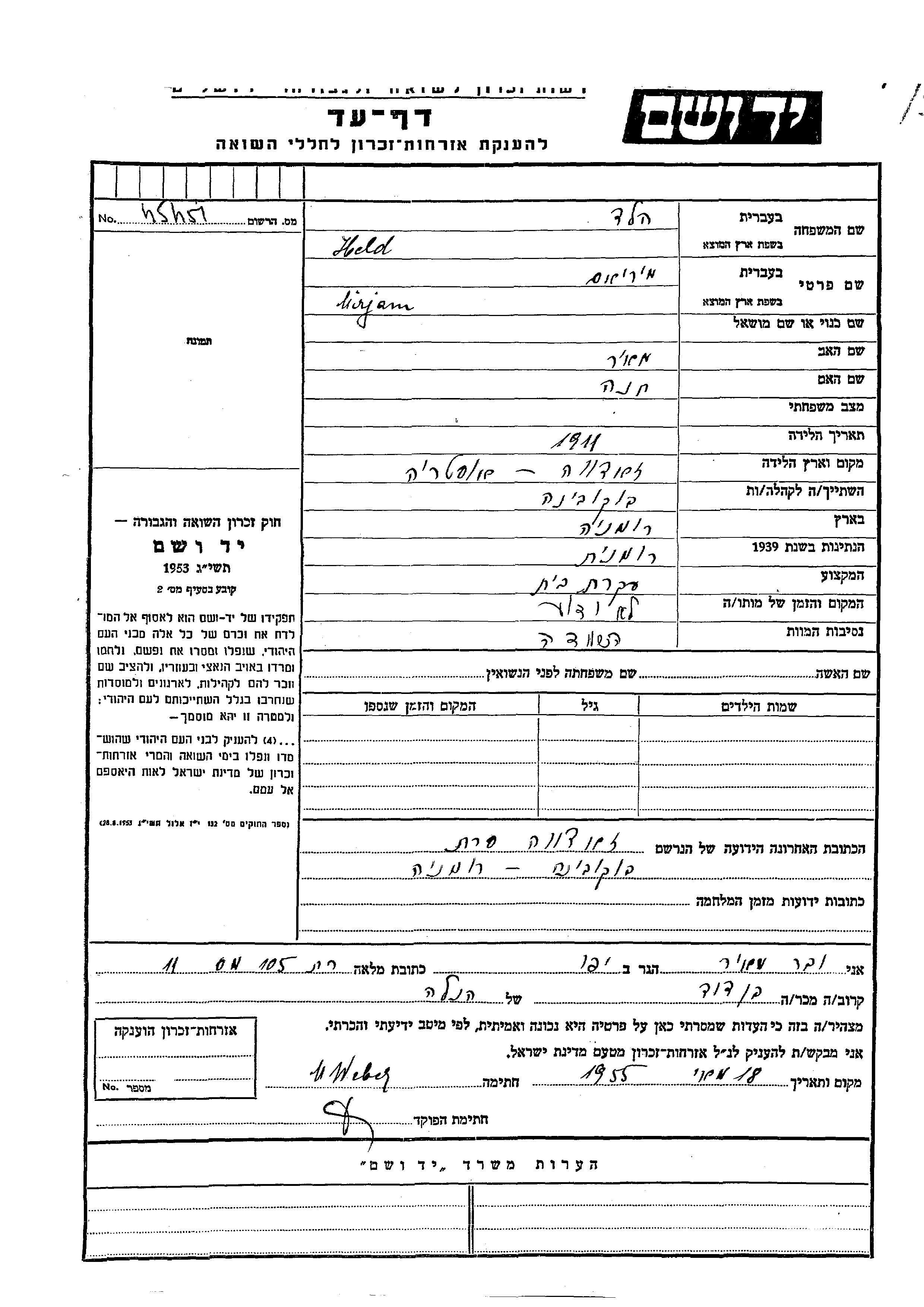 Mirjam Held wurde im Jahr 1911 in Jadova, Rumänien geboren. Sie war die Tochter von Meir und Khana. Sie war Hausfrau. Während des Krieges war sie in Jadova, Rumänien.