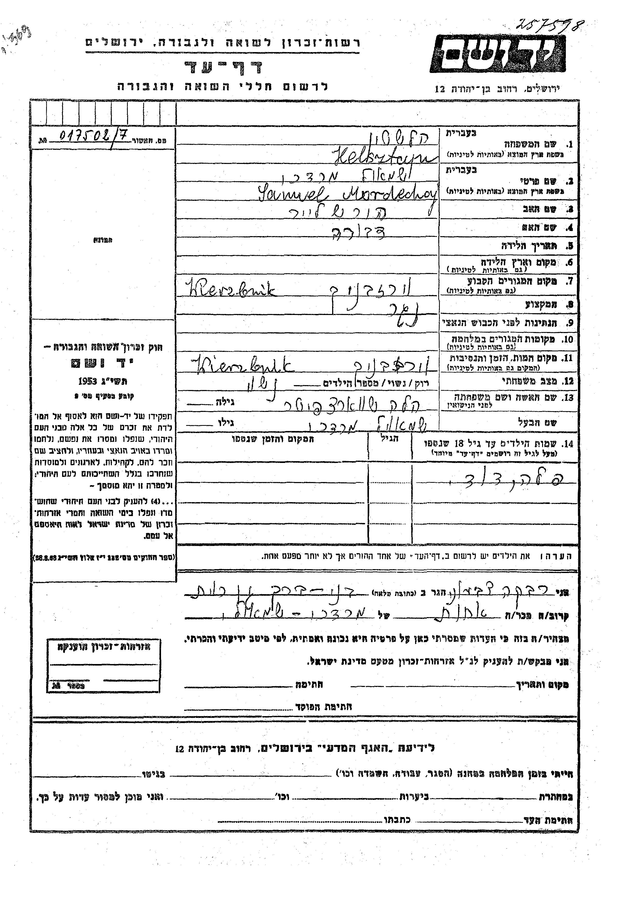 Mordechay Shmuel Helszajn Helshtein wurde Er war der Sohn von Hirsh Leib und Dvora. Er war Zimmermann und mit Hela, geb. Shvartzfiter Verheiratet. Vor dem Zweiten Weltkrieg lebte er in Wierzbnik, Polen.