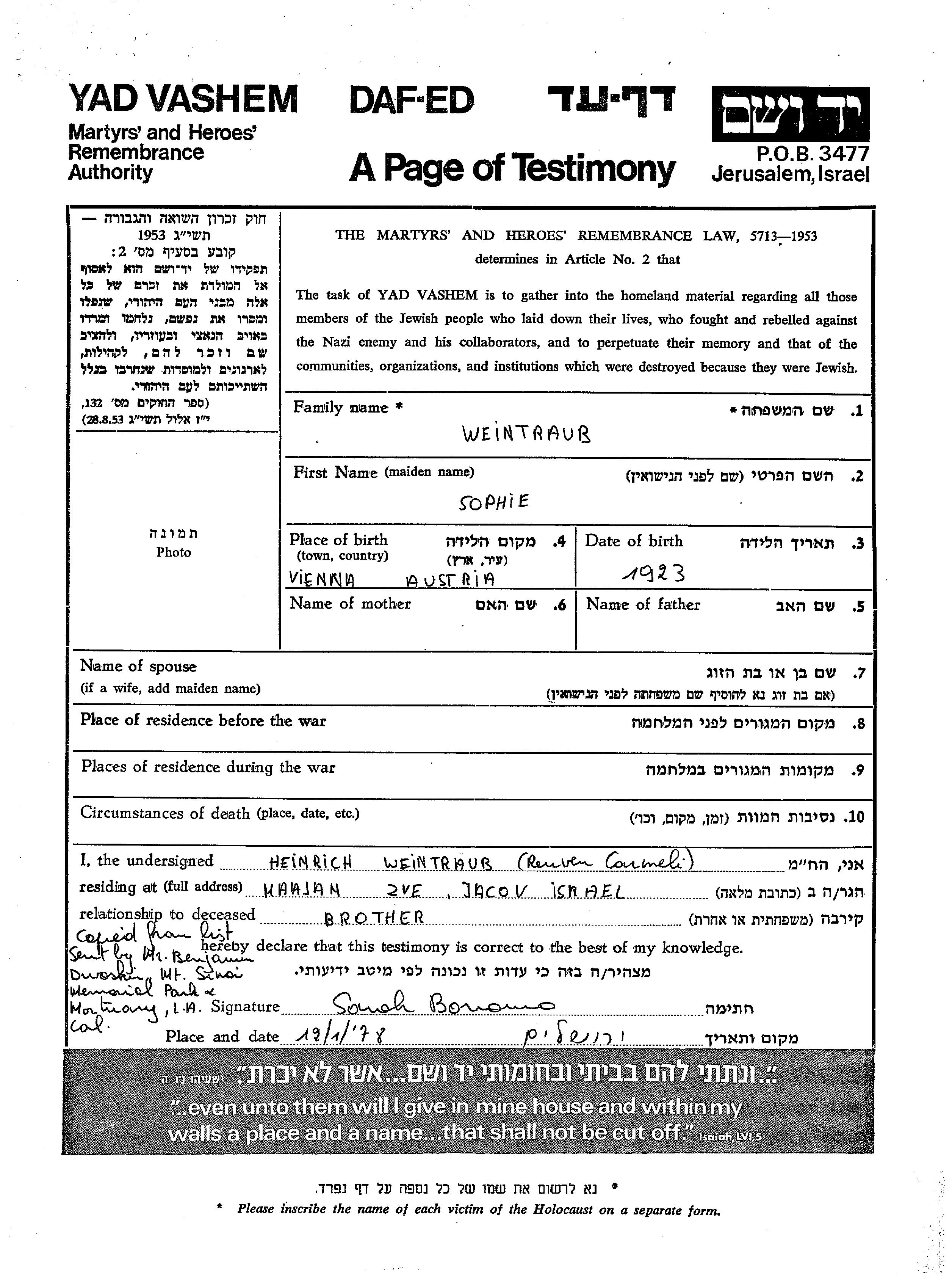 Sophie Weintraub wurde im Jahr 1923 in Vienna, Österreich geboren.