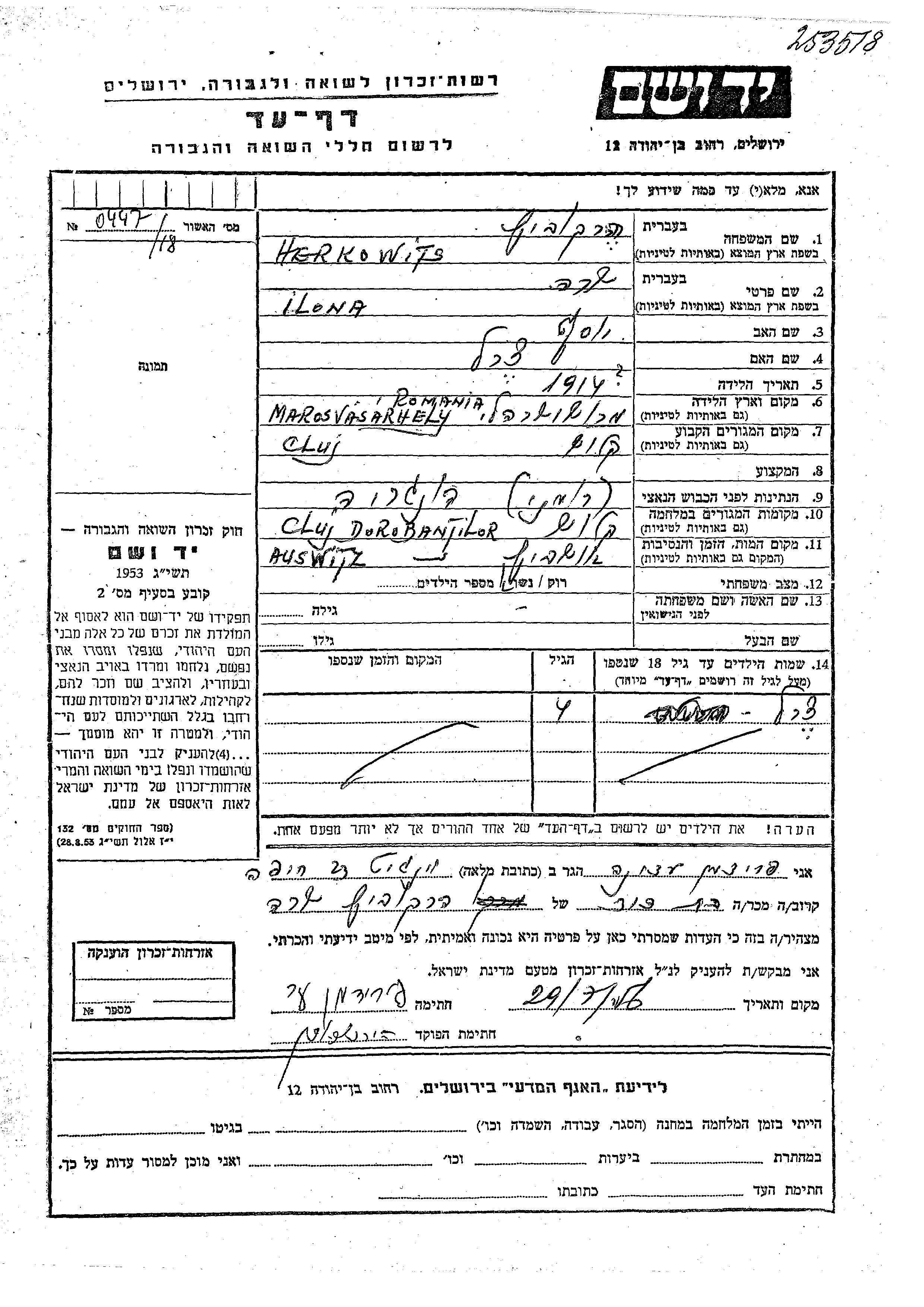 Ilona Sara Herkowits wurde im Jahr 1914 in Marosvasarhely, Rumänien geboren. Sie war die Tochter von Yosef und Tzira. Sie war Verheiratet. Vor dem Zweiten Weltkrieg lebte sie in Cluj, Rumänien. Während des Krieges war sie in Cluj, Rumänien.