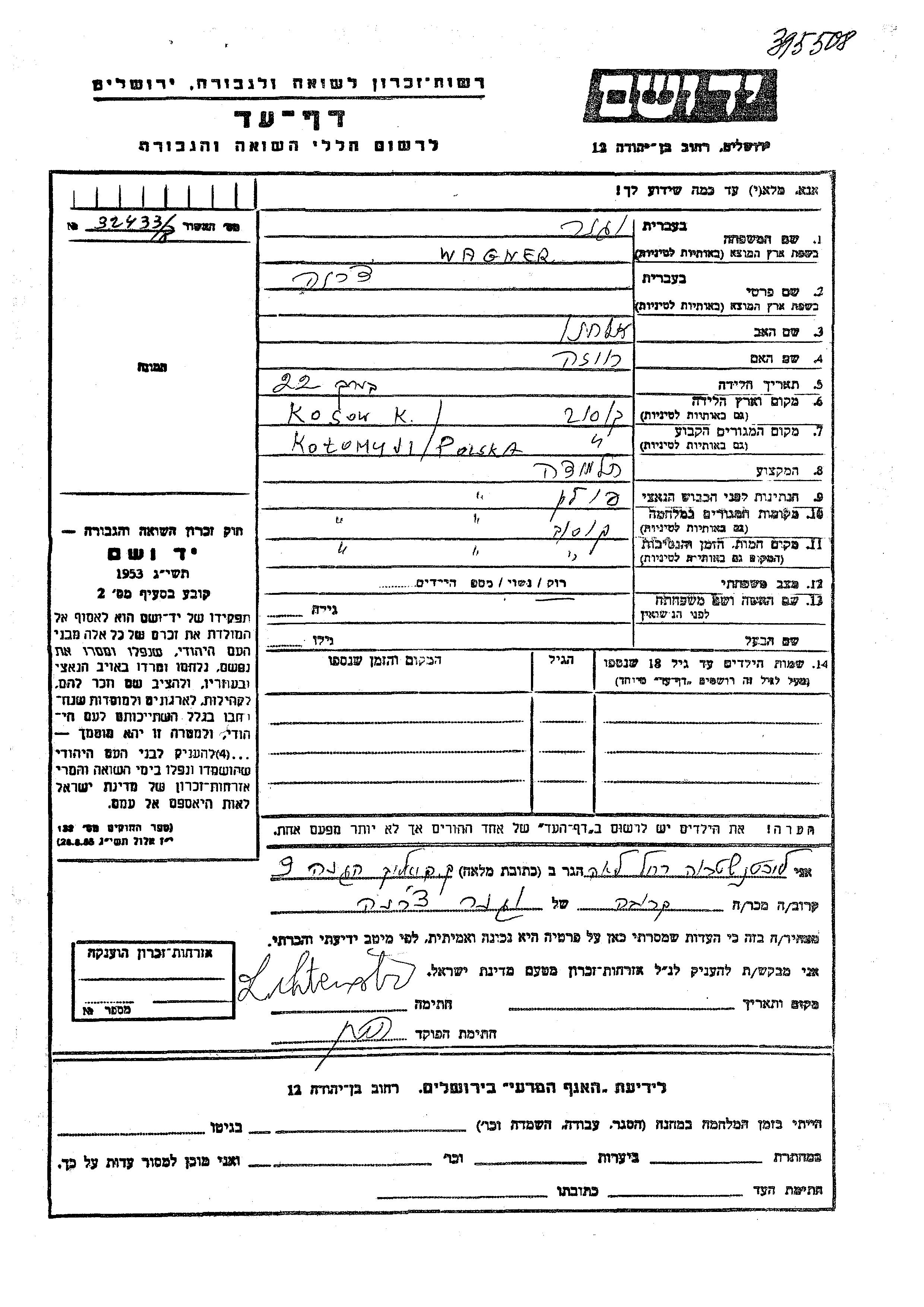 Charna Wagner wurde in Kosow, Polen geboren. Sie war die Tochter von Elkhanan und Roiza. Sie war Schüler/-in und Ledig. Vor dem Zweiten Weltkrieg lebte sie in Kosow, Polen. Während des Krieges war sie in Kosow, Polen.