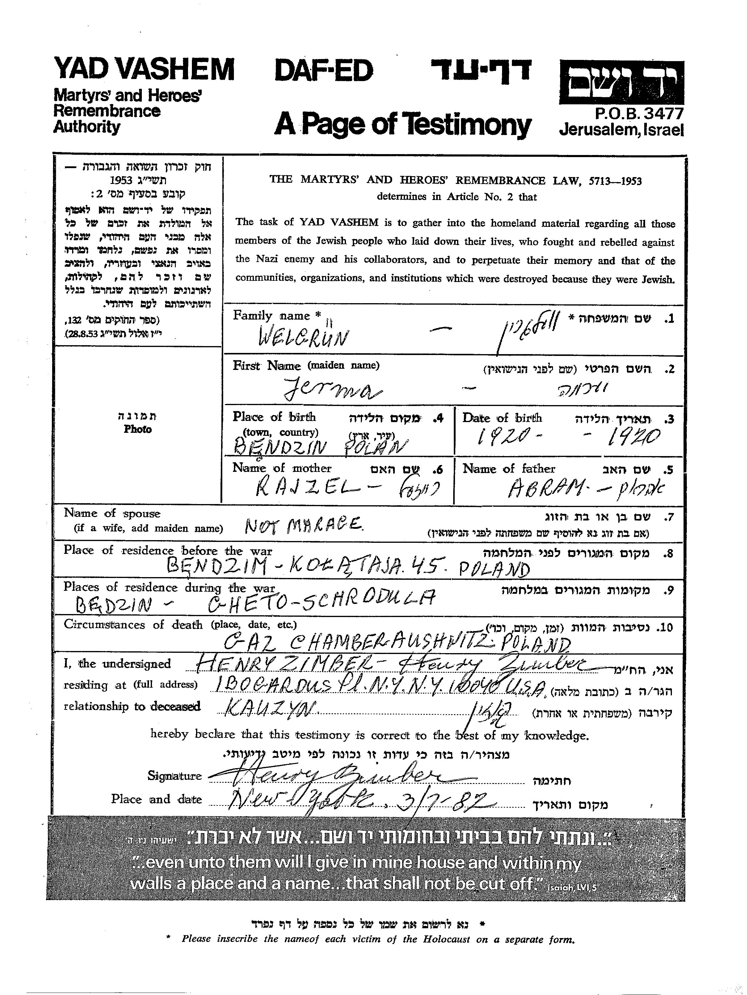 Jerma Welgruen wurde im Jahr 1920 in Bendzin, Polen geboren. Sie war die Tochter von Abram und Rajzel. Sie war Ledig. Vor dem Zweiten Weltkrieg lebte sie in Bendzin, Polen. Während des Krieges war sie in Sosnowiec Srodula, Polen.