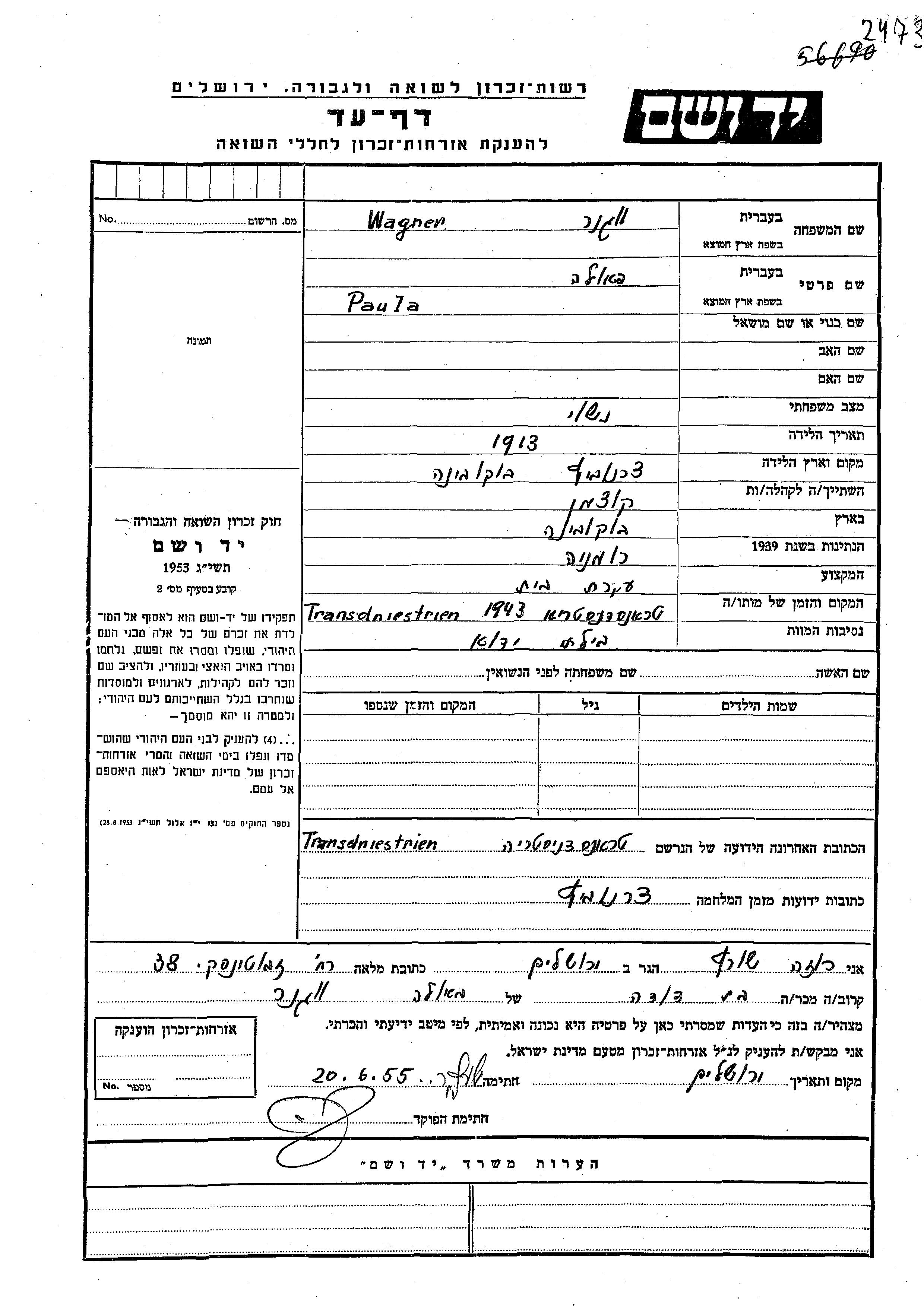 Paula Wagner wurde im Jahr 1913 in Cernauti, Rumänien geboren. Sie war Hausfrau. Vor dem Zweiten Weltkrieg lebte sie in Bukovina, Rumänien. Während des Krieges war sie in Cernauti, Rumänien.