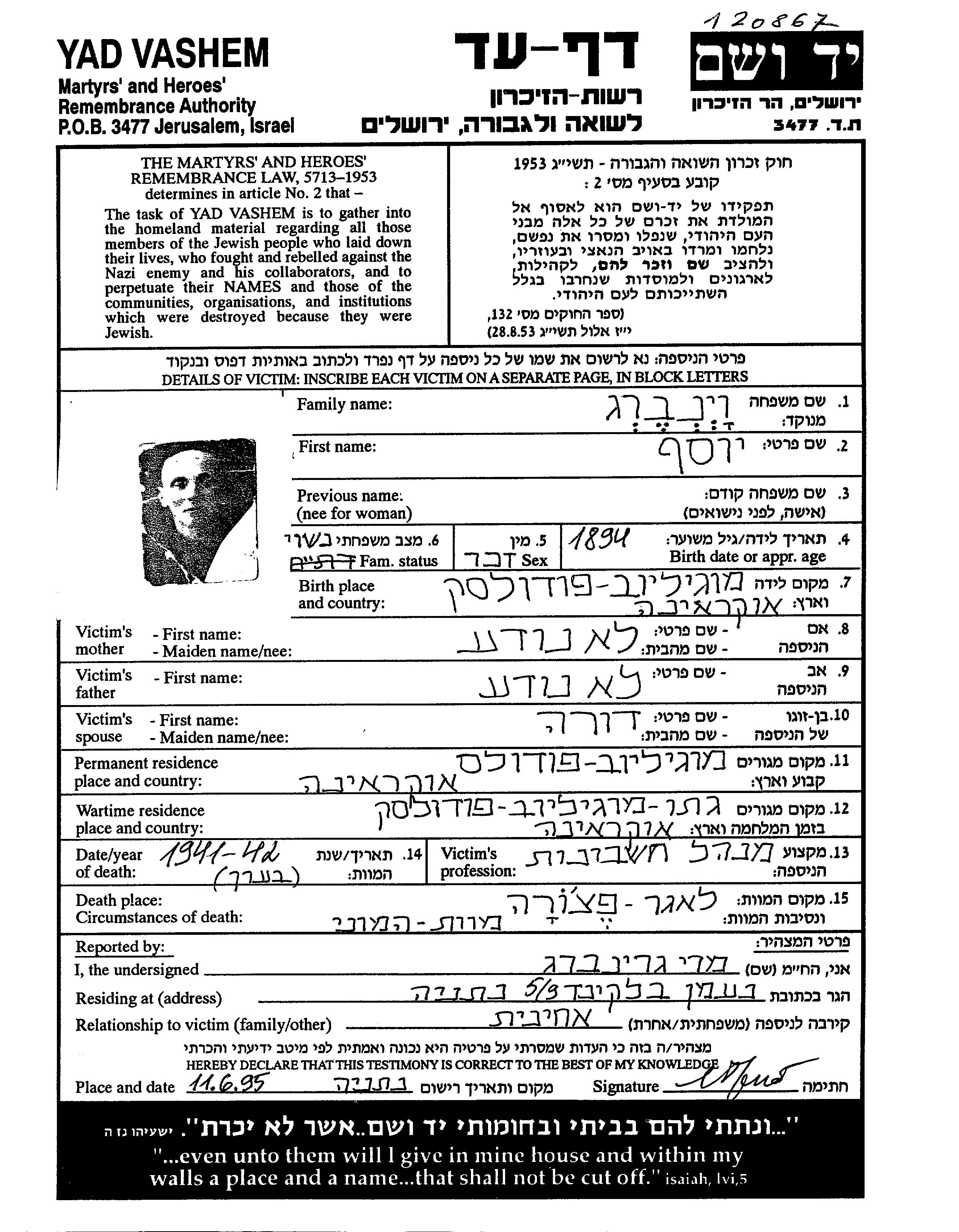 Yosef Vainberg wurde im Jahr 1894 in Mogilev Podolski, Ukraine (UdSSR) geboren. Er war Buchhalter/-in und mit Dora Verheiratet. Vor dem Zweiten Weltkrieg lebte er in Mogilev Podolski, Ukraine (UdSSR). Während des Krieges war er in Mogilev Podolski, Ukraine (UdSSR).