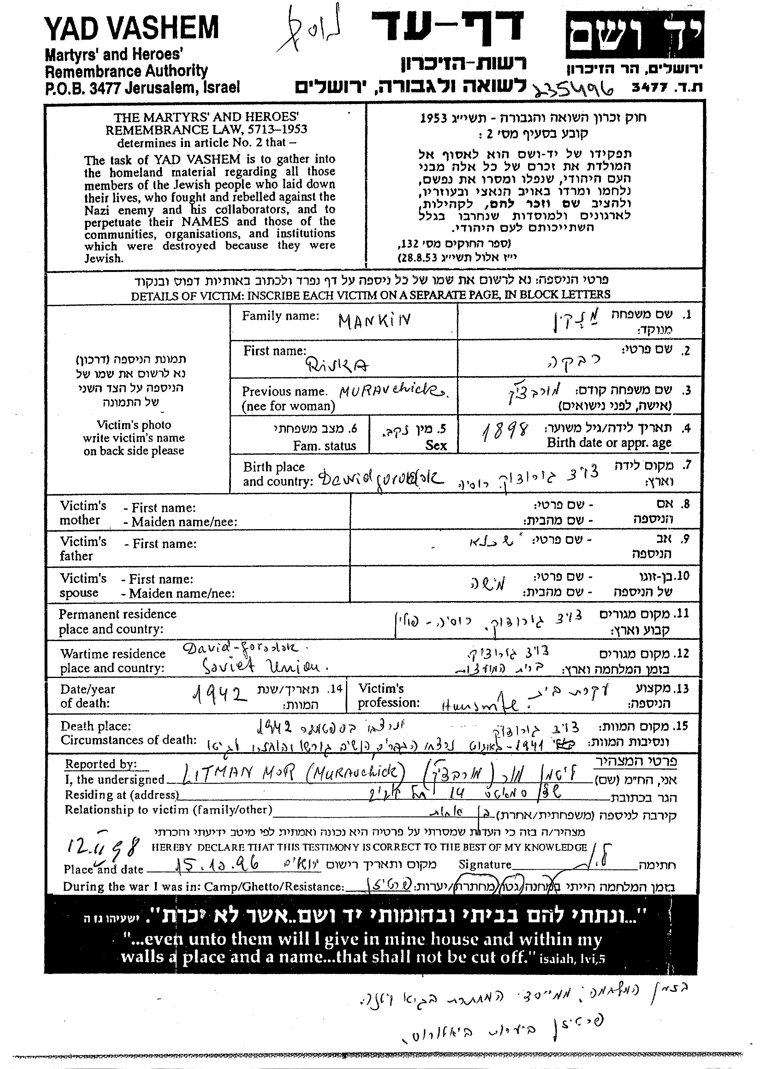 Rivka Mankin, geb. Muravchick wurde im Jahr 1898 in David Horodok, Polen geboren. Sie war die Tochter von Misha und Shachna. Sie war Hausfrau und Verheiratet. Vor dem Zweiten Weltkrieg lebte sie in David Horodok, Polen. Während des Krieges war sie in David Horodok, Polen.