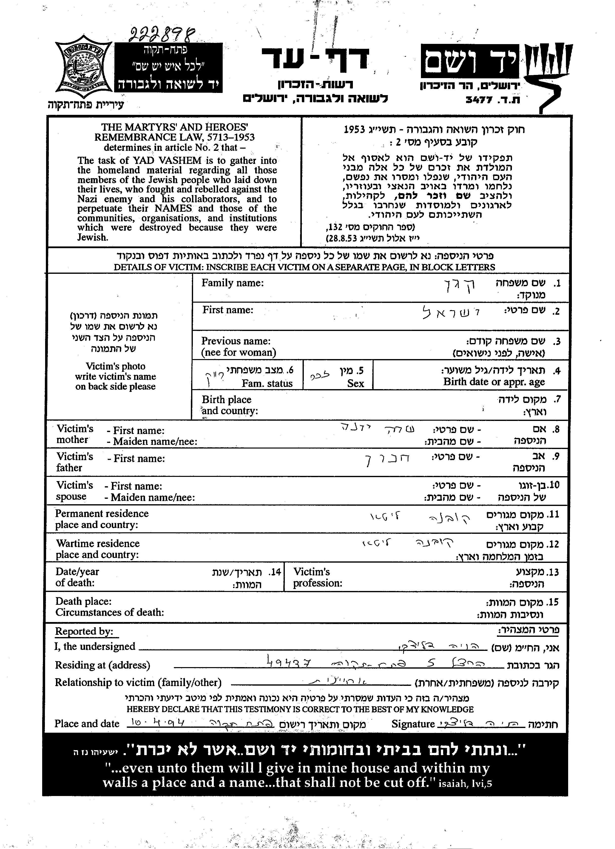 Yad Vashem - Gedenkblätter Sammlung