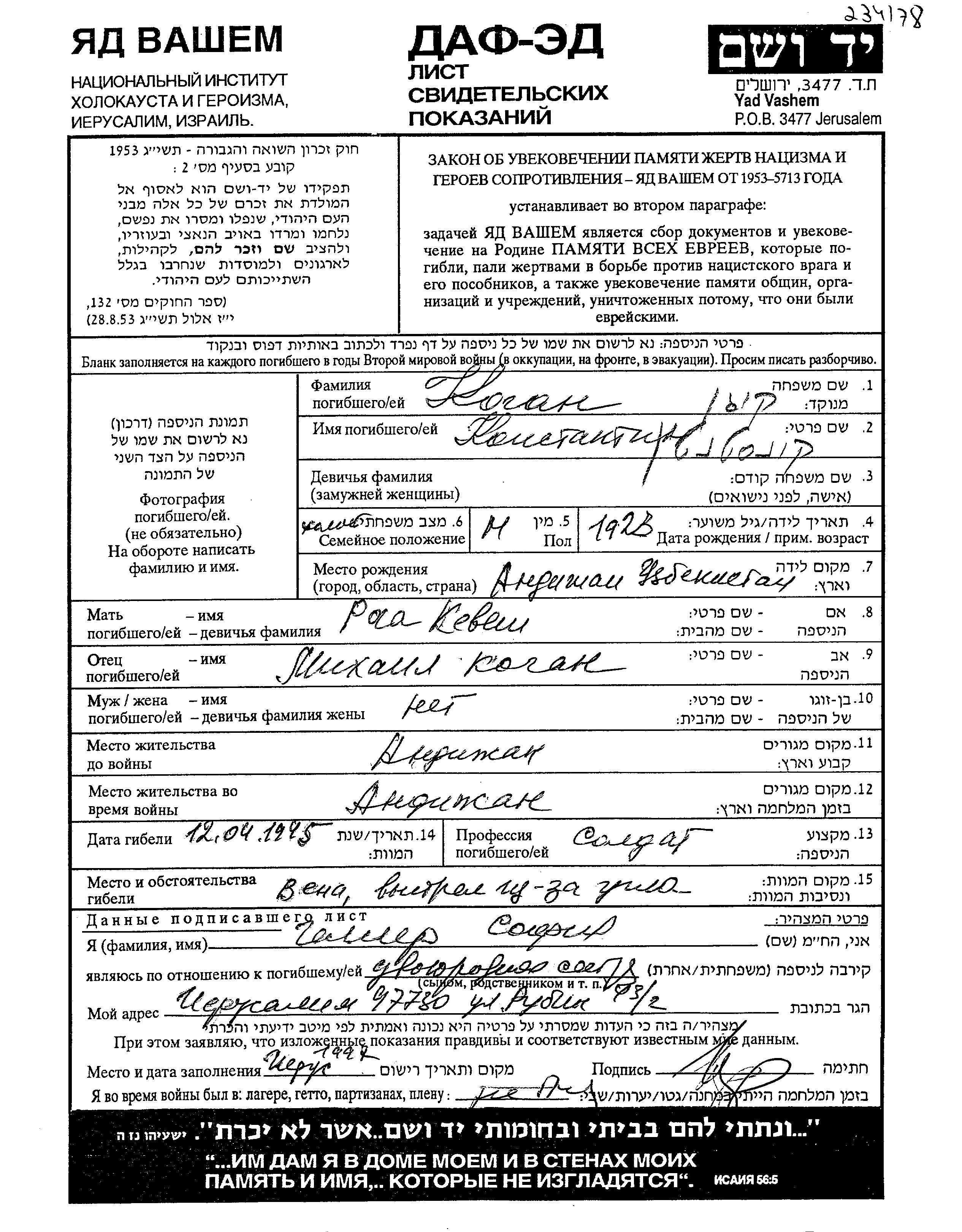Konstantin Kogan wurde im Jahr 1923 in Andizhan, Uzbekistan (UdSSR) geboren. Er war der Sohn von Mikhail und Rosa, geb. Kevesh. Er war Soldat und Ledig. Vor dem Zweiten Weltkrieg lebte er in Andizhan, Uzbekistan (UdSSR). Während des Krieges war er in die Sowjetischen Streitkräfte. Konstantin im Militärdienst umgekommen. Todesort: Wien, Österreich im Jahr 12/04/1945.
