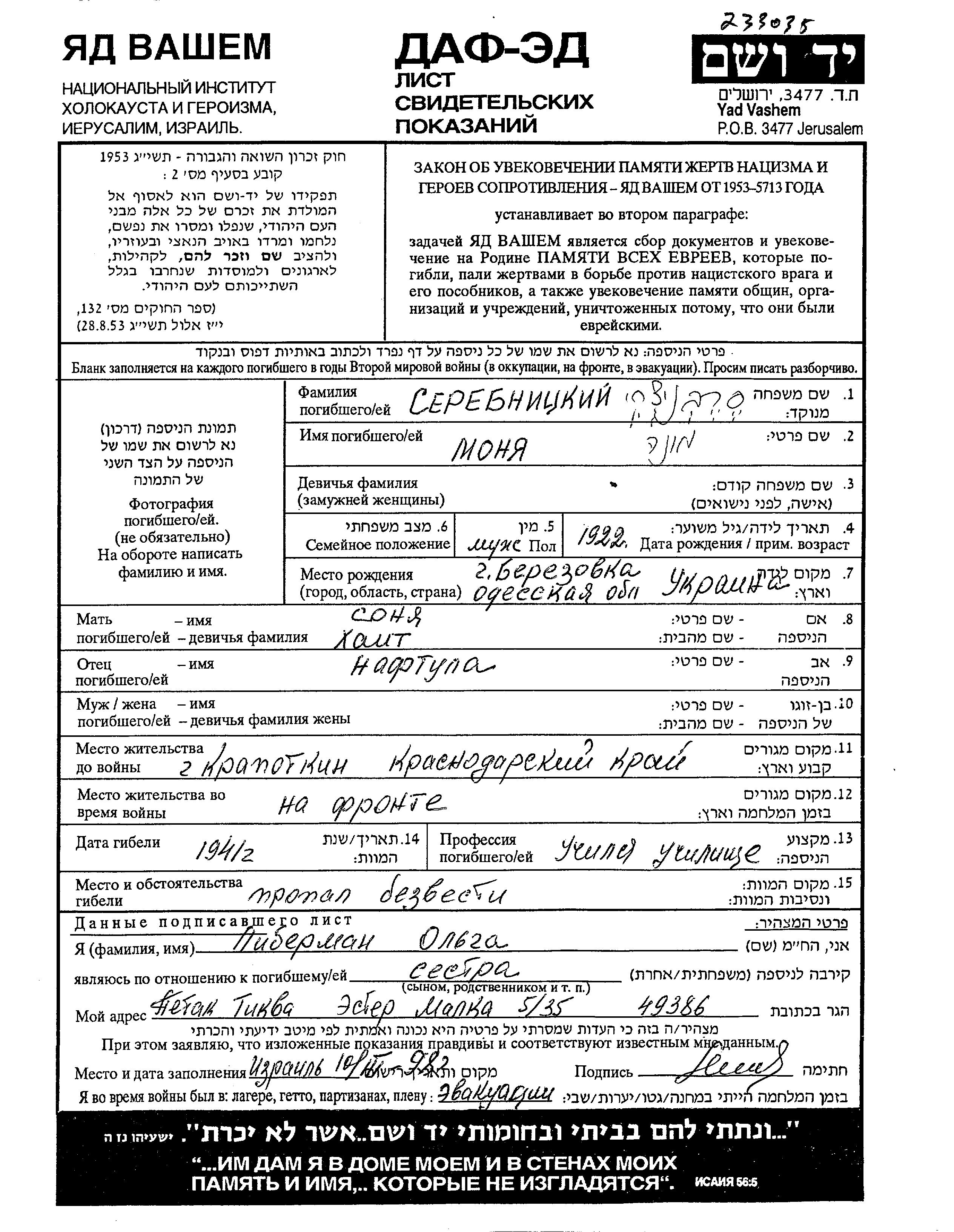 Monya Serebnitzki wurde im Jahr 1922 in Berezovka, Ukraine (UdSSR) geboren. Er war der Sohn von Naftula und Sonya, geb. Khait. Er war Schüler/-in. Vor dem Zweiten Weltkrieg lebte er in Kropotkin, Russland (UdSSR). Während des Krieges war er in die Sowjetischen Streitkräfte.